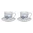Informations Techniques : Dimensions : L. 10,5 x l. 6,6 x H. 7,5 cm Matière : Grès Spécificités : Pratique & Utile Coffret 2 tasses Avec 2 sous-tasses Motif imprimé Capacité : 18 cl Poids : 0,3 kg Couleur : Blanc