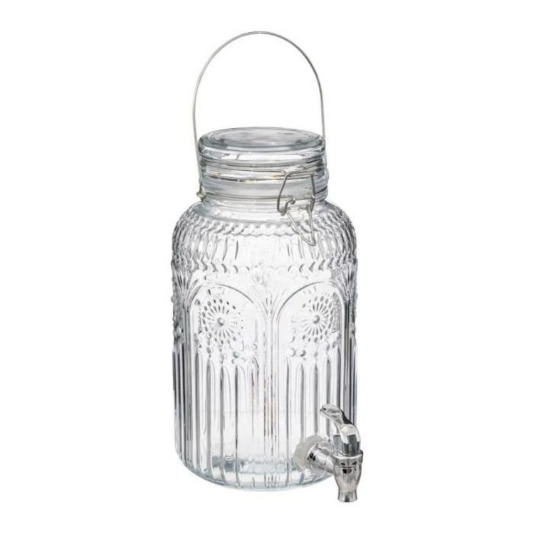 Informations Techniques : Dimensions : L. 21,5 x l. 16 x H. 29 cm Matière : Verre & Métal Spécificités : Pratique & Convivial Distributeur de boisson Verre sculpté Contenance : 3,8 litres Poids : 1,53 kg Couleur : Transparent