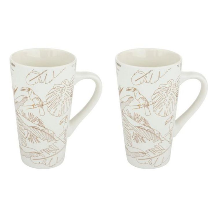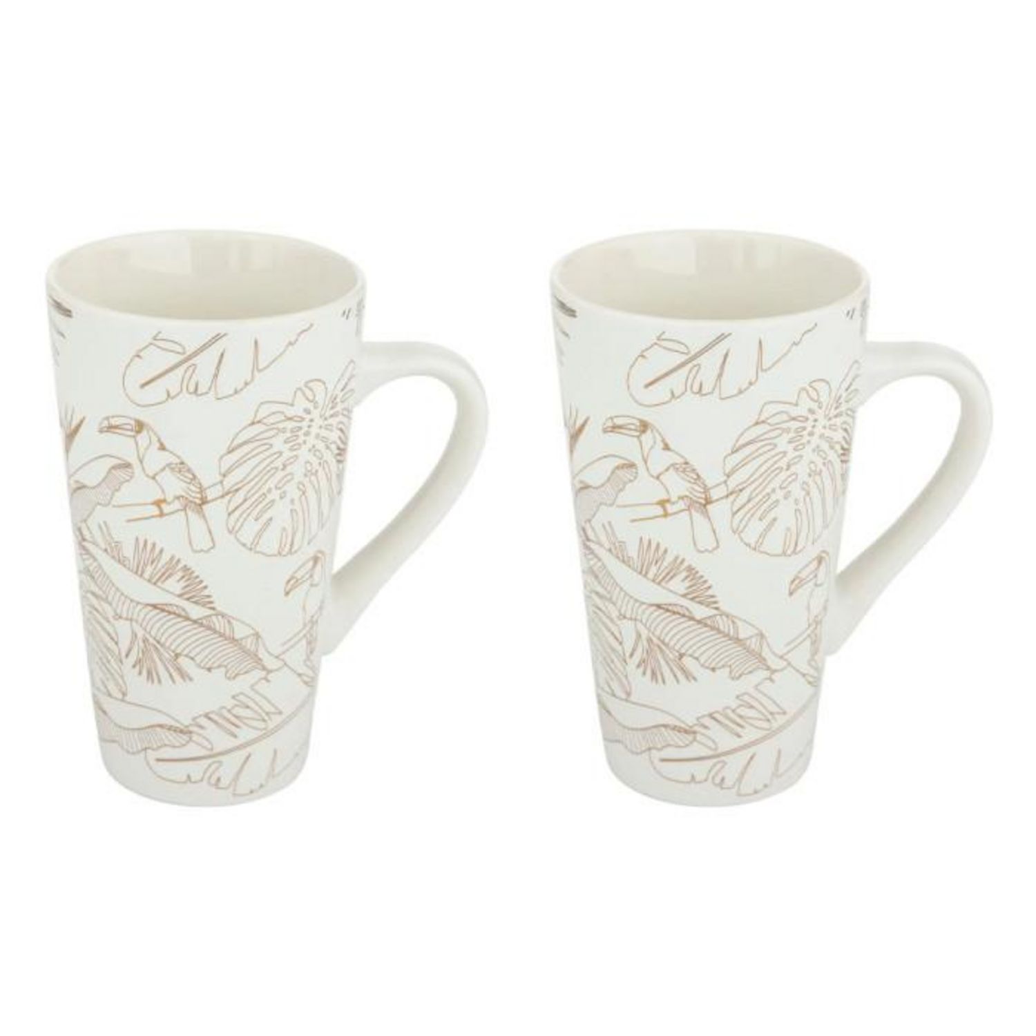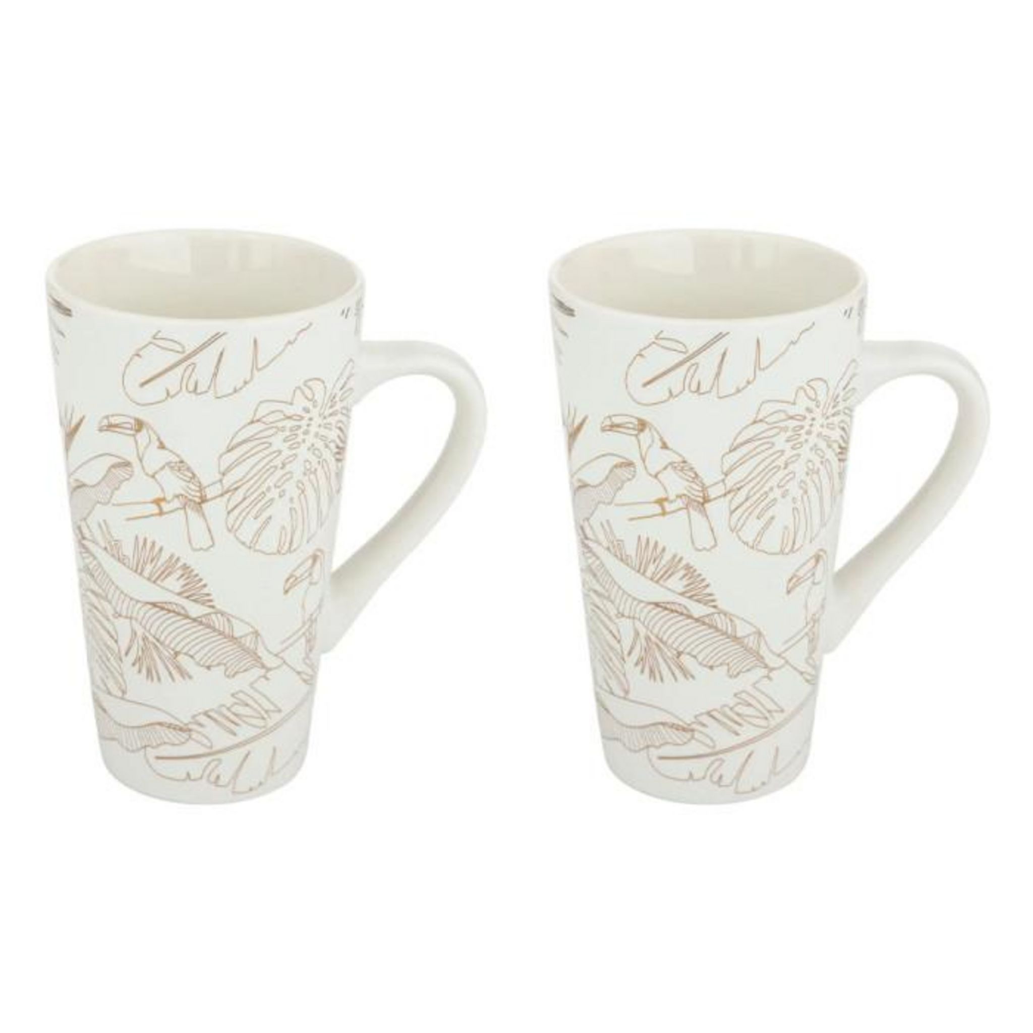Informations Techniques : Dimensions : L. 12,5 x l. 8,7 x H. 15,3 cm Matière : New Bone Spécificités : Élégant & Utile Lot de 2 mugs Imprimé toucan Imitation porcelaine Capacité : 50 cl Poids : 0,92 kg Couleur : Blanc