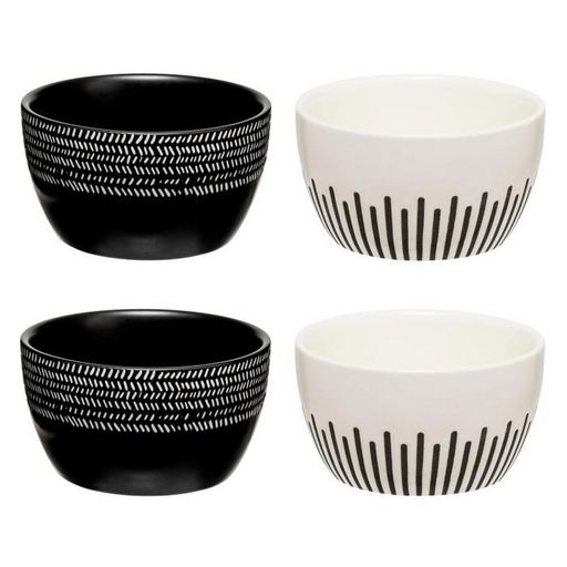 Informations Techniques : Dimensions : D. 10 x H. 5,5 cm Matière : Grès Spécificités : Pratique & Utile Lot de 4 coupelles Imprimé ethnique Compatible : Lave-vaisselle et micro-ondes Poids : 0,9 kg Couleur : Noir & Blanc