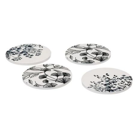 Informations Techniques : Dimensions : D. 10 x H. 3 cm Matière : Grès Spécificités : Pratique & Utile Lot de 4 dessous de verre Imprimé floral Forme ronde Poids : 0,38 kg Couleur : Blanc & Noir