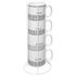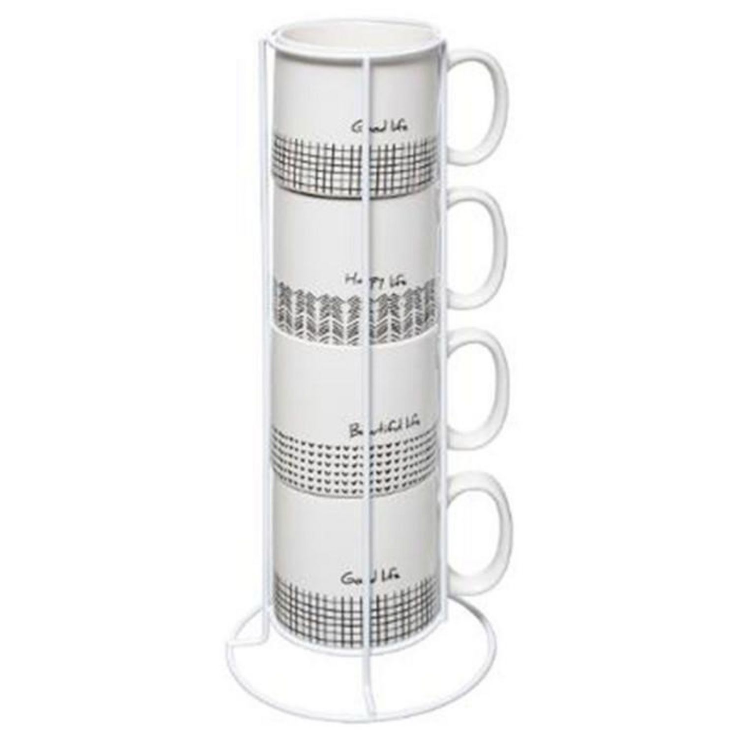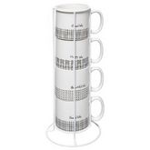 Informations Techniques : Dimensions : D. 7,5 x H. 8 cm Matière : Porcelaine Spécificités : Design & Pratique Lot de 4 Mugs & Rack Forme Ronde A Motifs Contact Alimentaire Passage au Lave-Vaisselle & au Micro-Ondes Contenance : 24 cl Couleur : Blanc