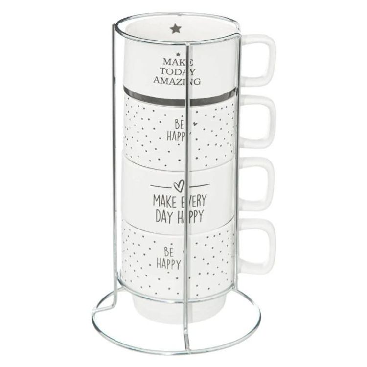 Informations Techniques : Dimensions : D. 8 x H. 7,2 cm Matières : Porcelaine & Acier inoxydable Spécificités : Pratique & Utile Lot de 4 Mugs Sur Rack Forme Ronde Contact Alimentaire Motif Homogène : 2 Inscriptions Be Happy , 1 Inscription Make Today Amazing & 1 Inscription Make Every Day Happ