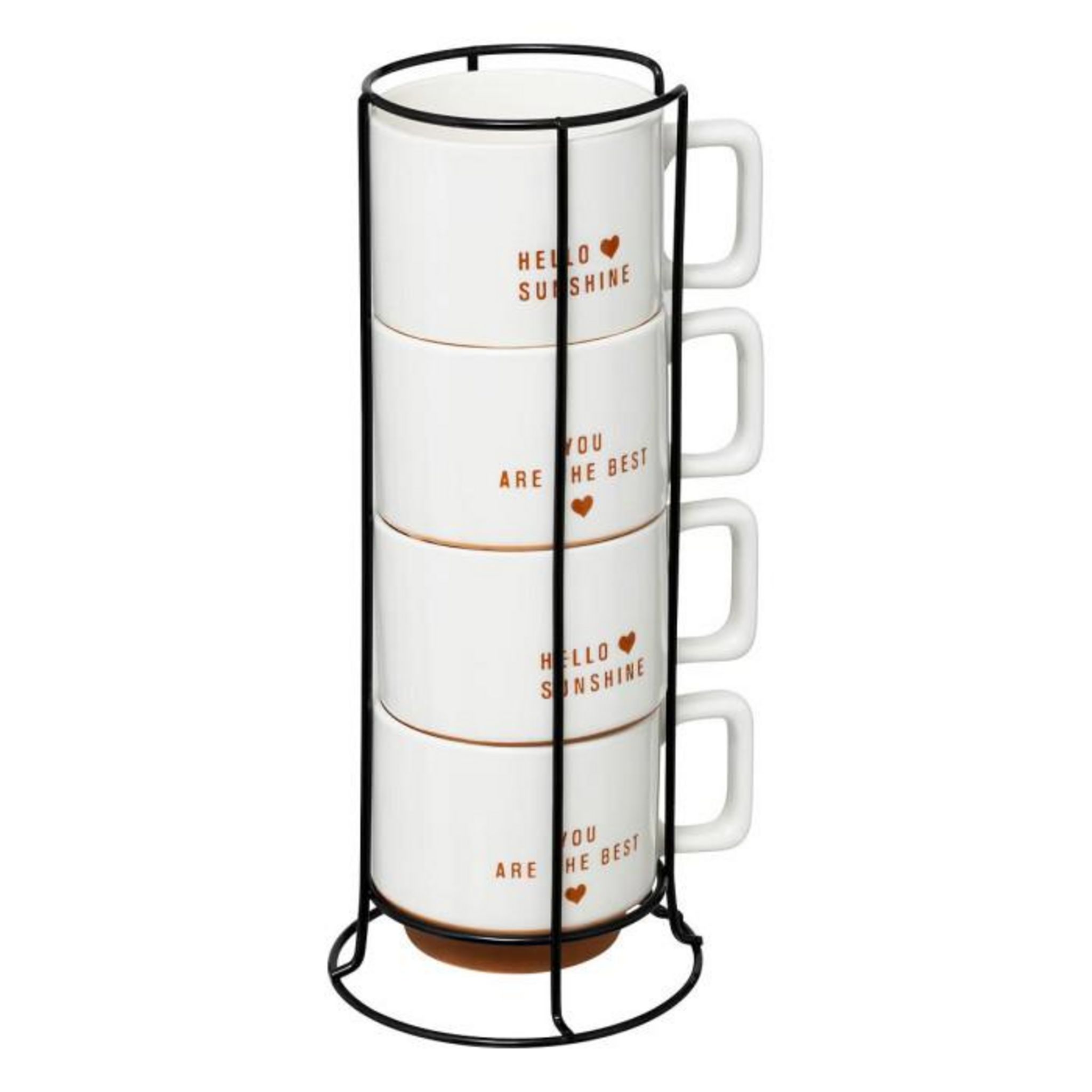 p>Lot de 4 Mugs sur Rack Hello 30cl BlancApportez une touche de bonne humeur à vos pauses avec ce Lot de 4 Mugs sur Rack Hello 30cl Blanc ornés des inscriptions inspirantes Hello Sunshine et You Are The Best . Leur design épuré et moderne s'intègre facilement dans tous les intérieurs. Pratiqu