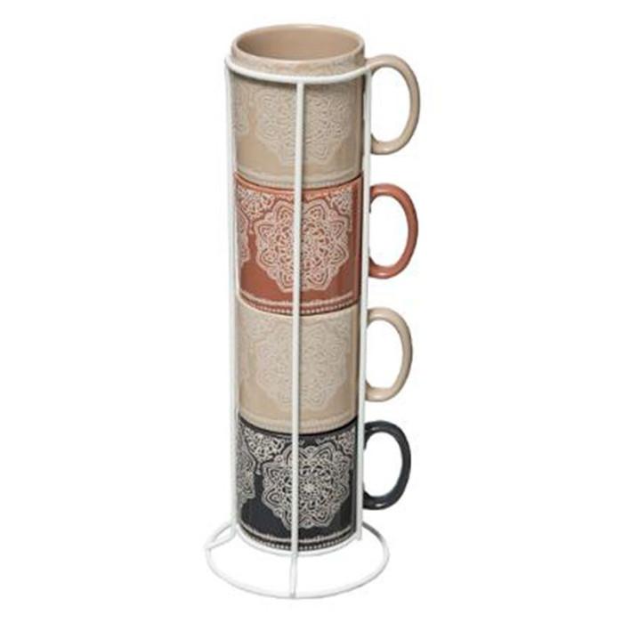 Informations Techniques : Dimensions : L. 12,5 x l. 11,7 x H. 33,5 cm Tasse : L. 10,3 x l. 7,5 x H. 8,2 cm Rack : D. 11,7 x H. 33,5 cm Matières : Faïence & Fer Spécificités : Pratique & Utile Lot de 4 Mugs Rack inclus Style Ethnique Facile d'entretien & d'utilisation Poids : 1,055 kg Couleur : Mult