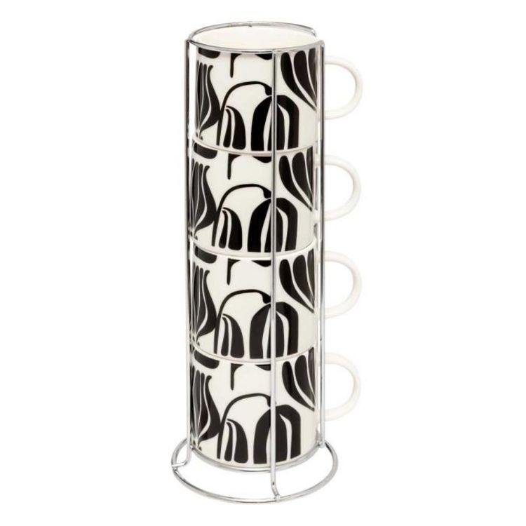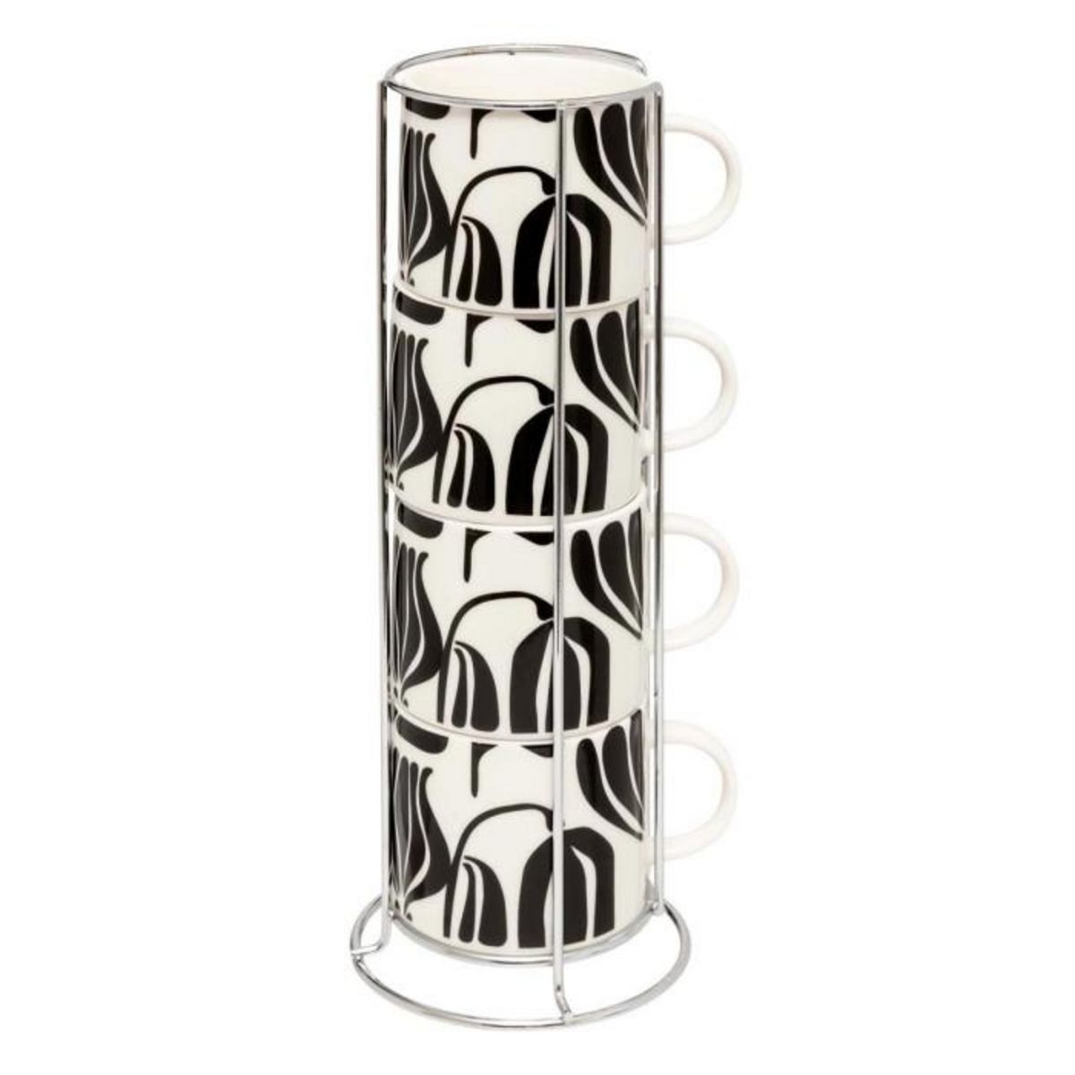 Informations Techniques : Dimensions : L. 10,8 x l. 10,8 x H. 29,6 cm Matières : Porcelaine & Acier Spécificités : Pratique & Utile Lot de 4 mugs sur rack Imprimé floral Design bicolore Capacité : 23 cl Poids : 1,02 kg (à l'unité) Couleur : Noir & Blanc