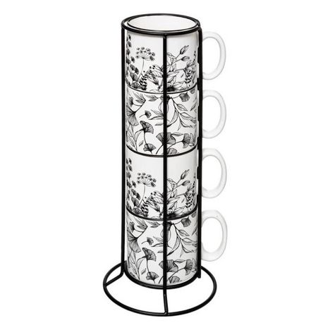 Informations Techniques : Dimensions : D. 12 x H. 33 cm Matière : Porcelaine Spécificités : Pratique & Utile Lot de 4 Mugs Rack inclus Forme Ronde A Motifs Capacité : 24 cl Poids : 1,116 kg Couleur : Blanc & Noir