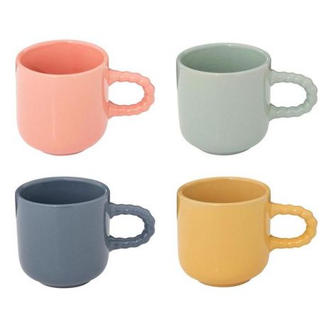 Informations Techniques : Dimensions : L. 9,9 x l. 6,4 x H. 6,4 cm Matière : Grès Spécificités : Coloré & Pratique Lot de 4 tasses à café Anses torsadées Contenance : 12 cl Poids : 0,14 kg Couleur : Multicolore