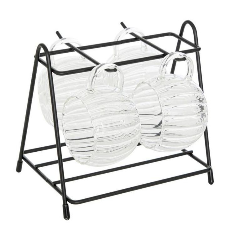 Informations Techniques : Dimensions : L. 17 x l. 15 x H. 15,8 cm Matières : Verre & Métal Spécificités : Élégant & Pratique Lot de 4 tasses à café Sur rack en acier Capacité : 18 cl Poids : 0,41 kg Couleur : Transparent