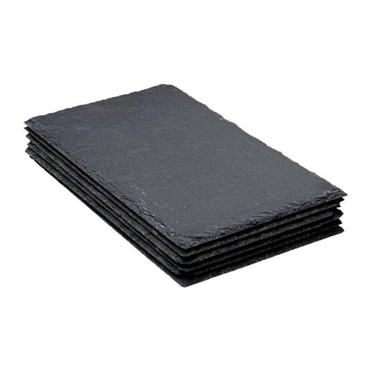 Informations Techniques : Dimensions : L. 30 x l. 18 x H. 1 cm Matière : Ardoise Spécificités : Tendance & Pratique Lot de 6 Assiettes Plates Contact Alimentaire Forme Rectangulaire Facile d'entretien & d'utilisation Poids : 0,83 kg Couleur : Gris
