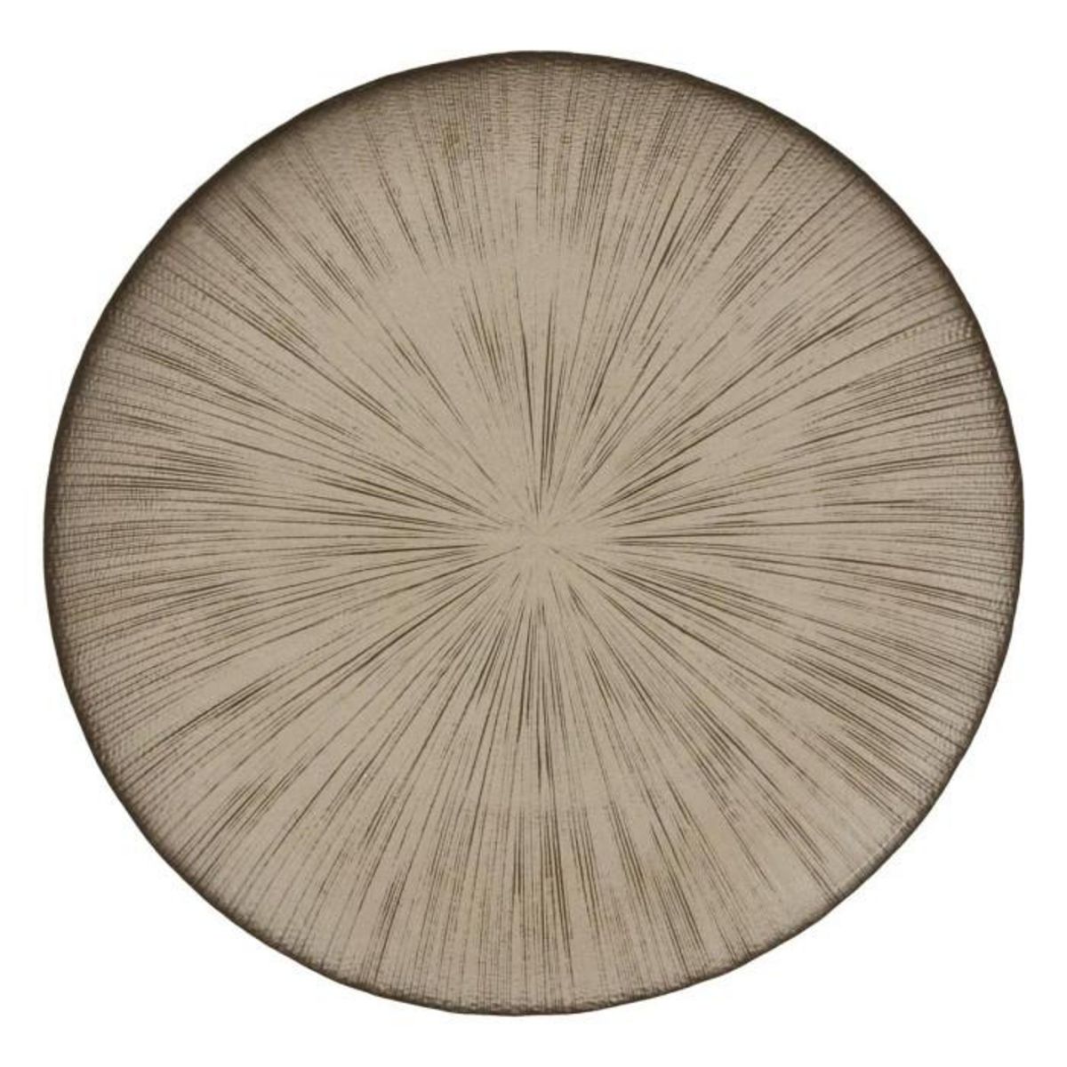 Informations Techniques : Dimensions : D. 28 x H. 2,5 cm Matière : Verre Spécificités : Élégant & Design Lot de 6 assiettes plates Imprimé effet plissé Poids : 0,4 kg (à l'unité) Couleur : Champagne