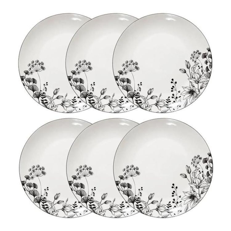 Informations Techniques : Dimensions : D. 27 x H. 3 cm Matière : Porcelaine Spécificités : Pratique & Utile Lot de 6 Assiettes Plates Forme Ronde Passage au Lave-Vaisselle & au Micro-Ondes A Motifs Poids : 0,73 kg Couleur : Blanc