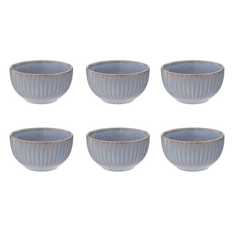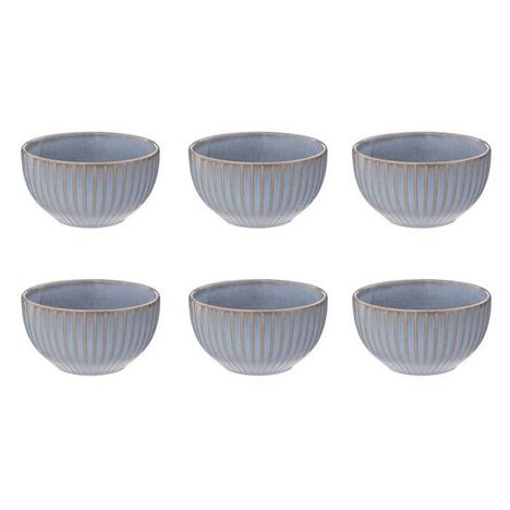 Informations Techniques : Dimensions : D. 13,5 x H. 7,5 cm Matière : Grès Spécificités : Pratique & Utile Lot de 6 bols Avec rayures Passage au lave-vaisselle & micro-ondes Contenance : 63 cl Poids : 0,47 kg Couleur : Bleu