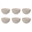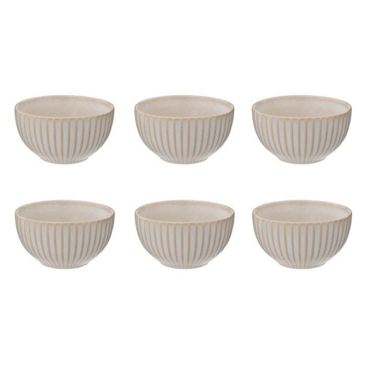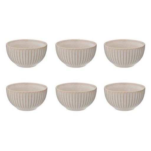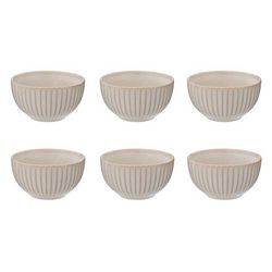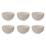 Informations Techniques : Dimensions : D. 13,5 x H. 7,5 cm Matière : Grès Spécificités : Pratique & Utile Lot de 6 bols Avec rayures Passage au lave-vaisselle & micro-ondes Contenance : 63 cl Poids : 0,47 kg Couleur : Crème