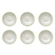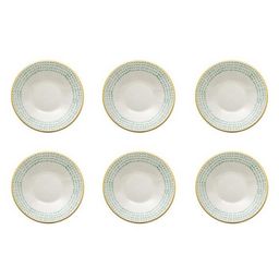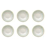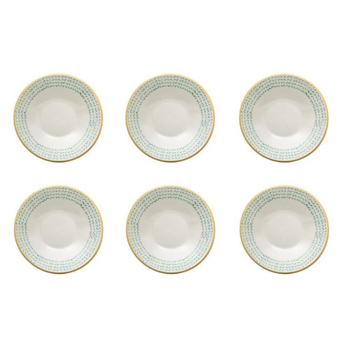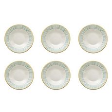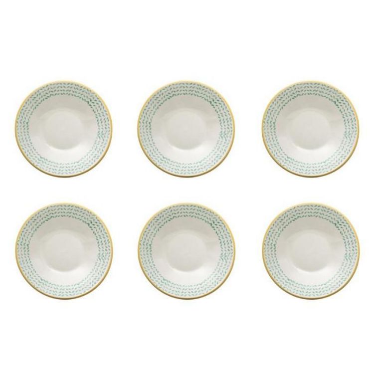 Informations Techniques : Dimensions : D. 19 x H. 5 cm Matière : Faïence Spécificités : Vendu par lot de 6 Compatible lave vaisselle Compatible micro onde Poids : 0,340 kg Couleur : Vert menthe & blanc