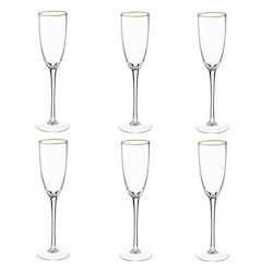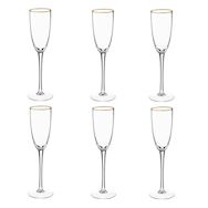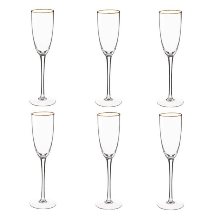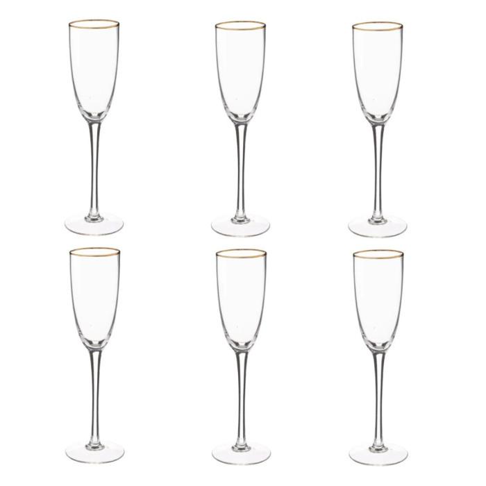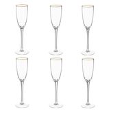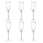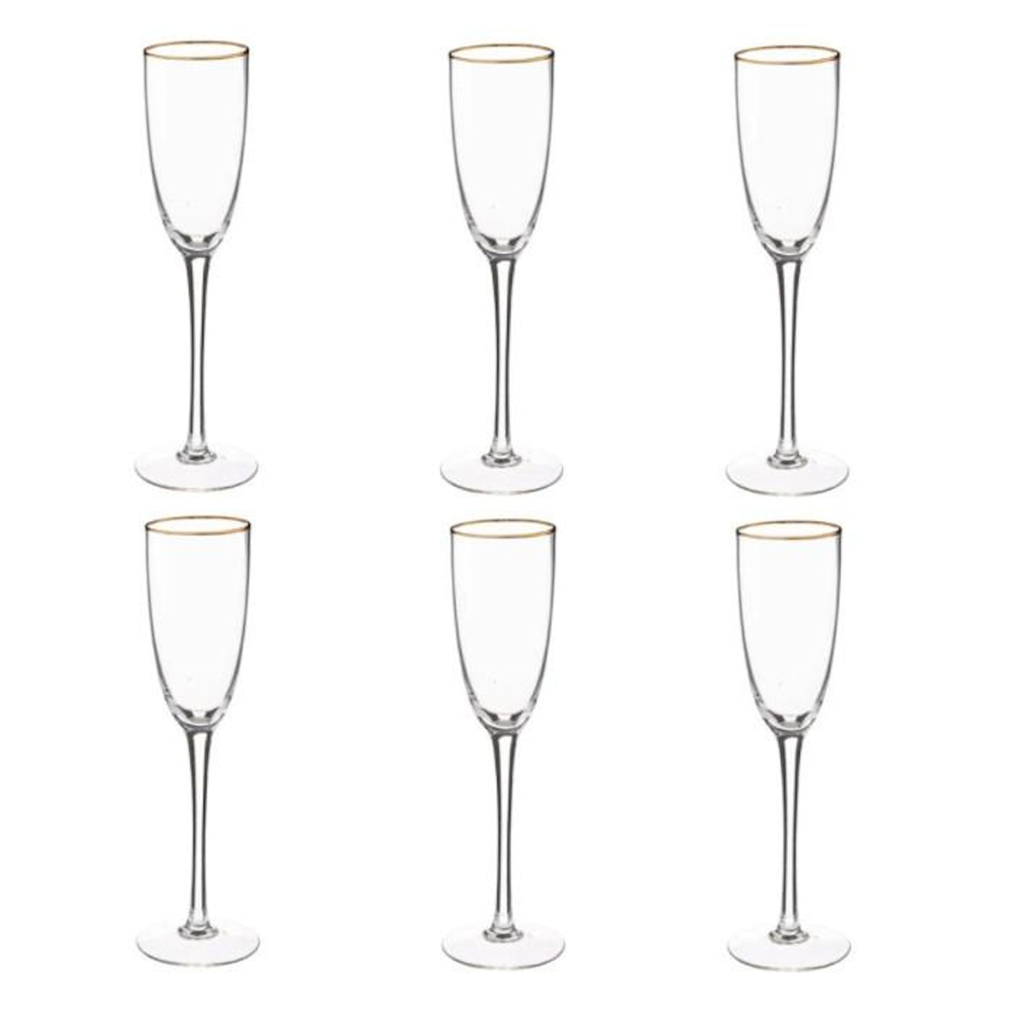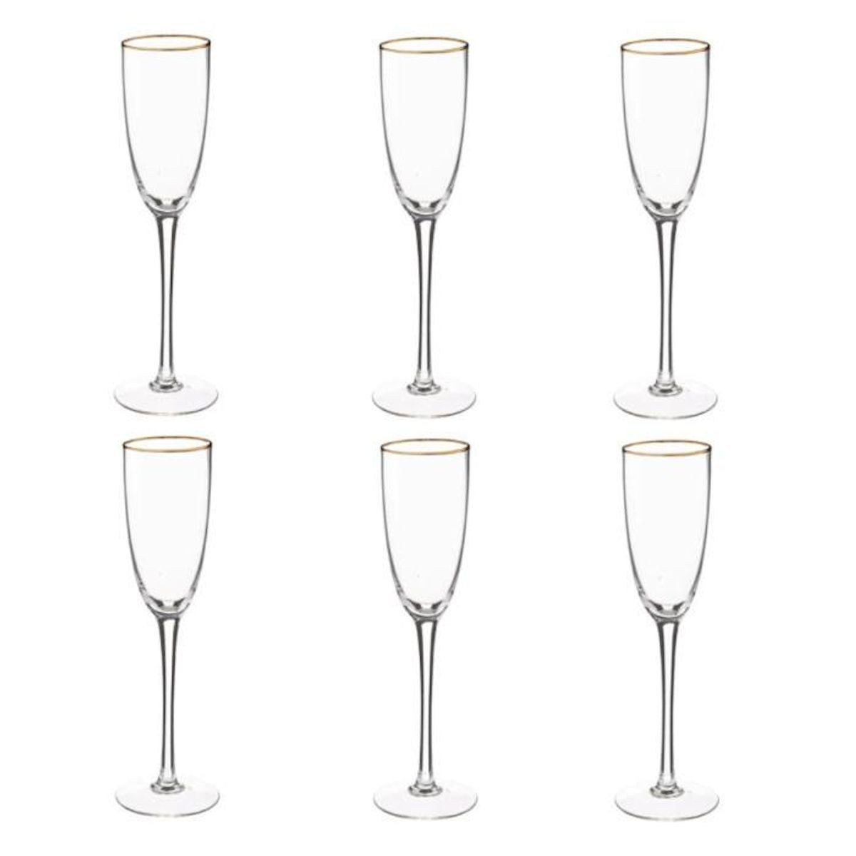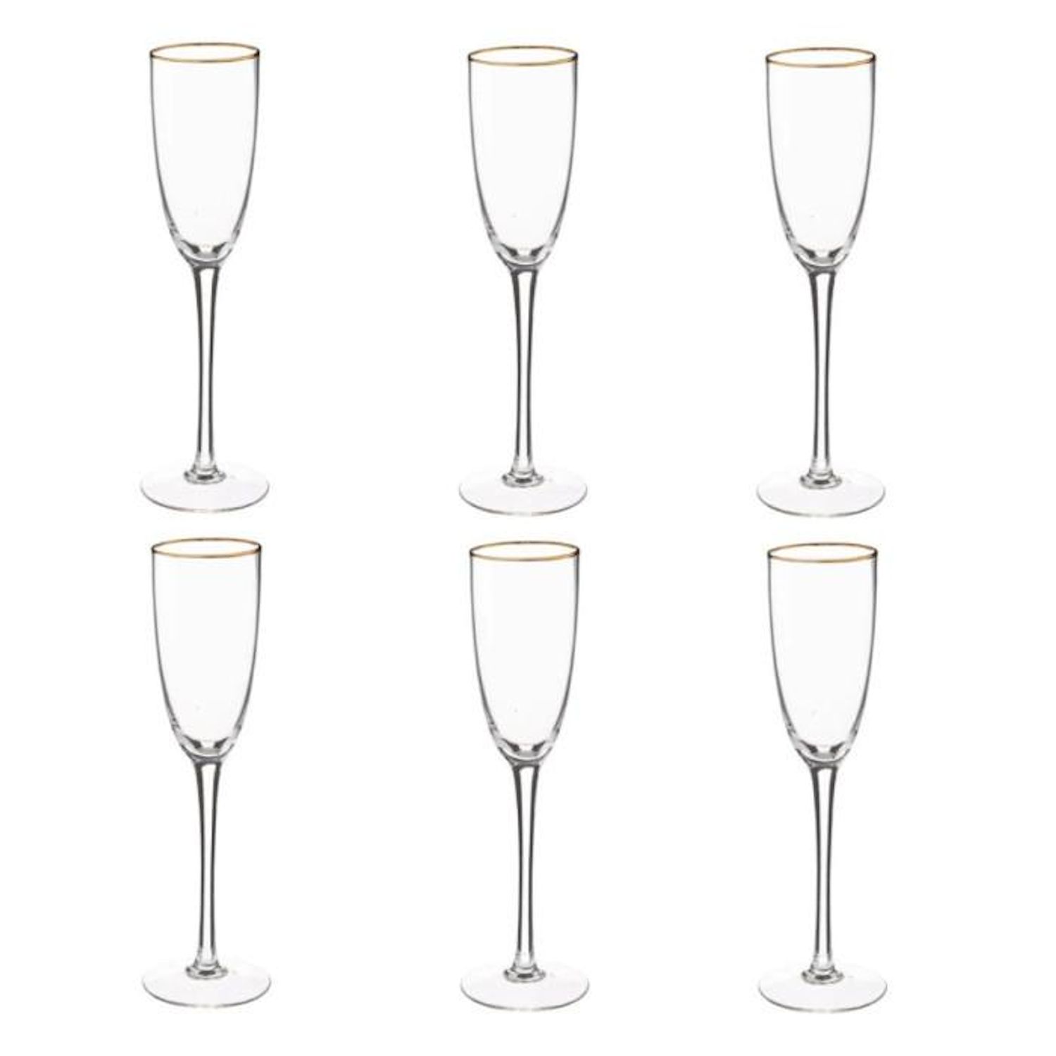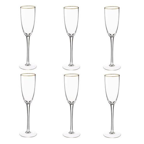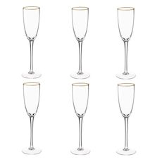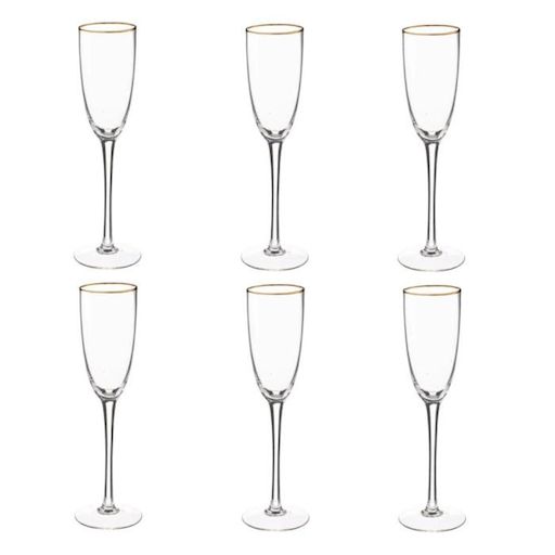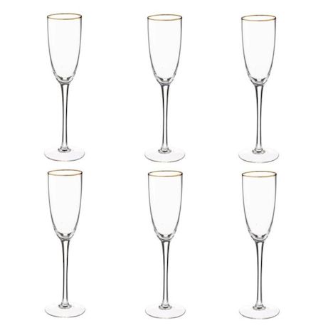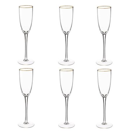 Informations Techniques : Dimensions : D. 7,5 x H. 26 cm Matière : Verre Spécificités : Pratique & Tendance Lot de 6 flûtes à Champagne Liseré doré Contenance : 25 cl Poids : 0,14 kg Couleur : Transparent