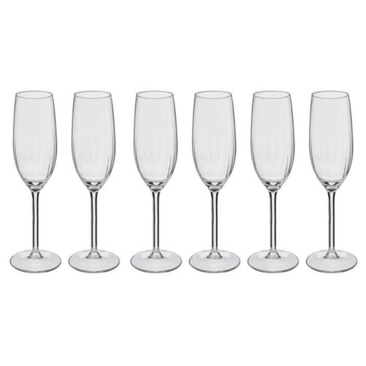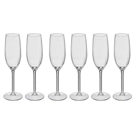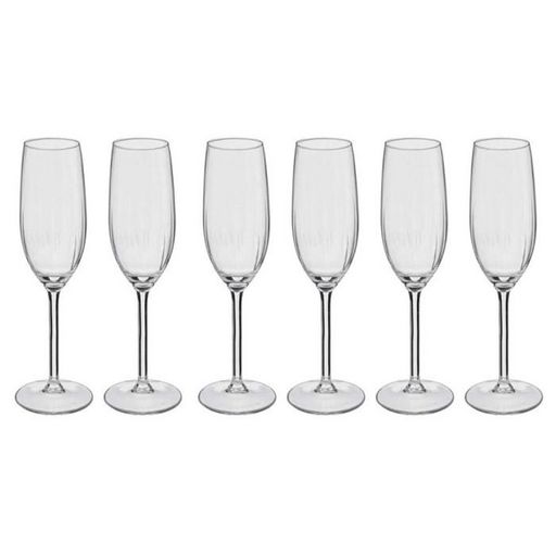 Informations Techniques : Dimensions : D. 6,5 x H. 23 cm Matière : Verre Spécificités : Chic & Tendance Lot de 6 Flûtes à Champagne Forme Ronde Contenance : 21 cl Passage au Lave-Vaisselle Couleur : Transparent