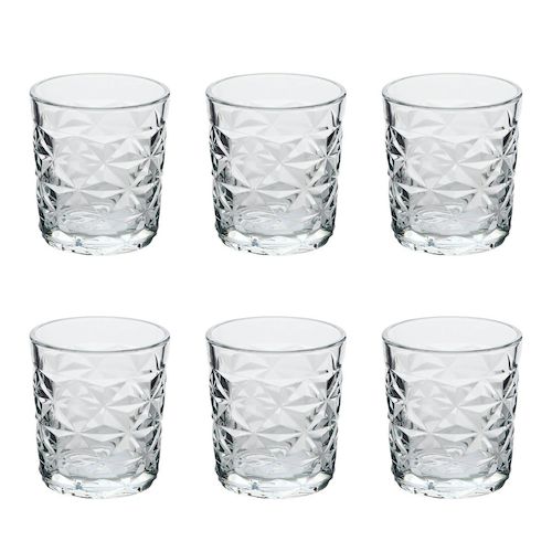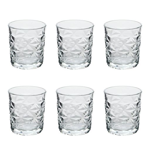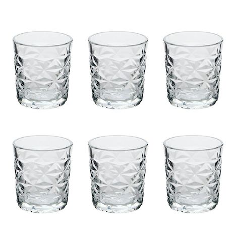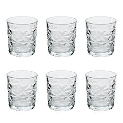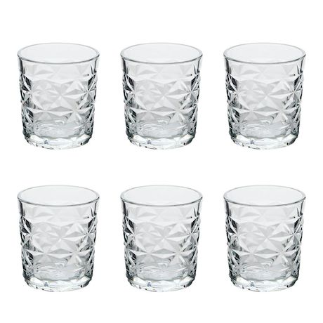 Informations Techniques : Dimensions : D. 9,5 x H. 8,5 cm Matière : Verre Spécificités : Pratique & Utile Lot de 6 verres à eau Design texturé bas Capacité : 30 cl Poids : 0,31 kg (à l'unité) Couleur : Transparent