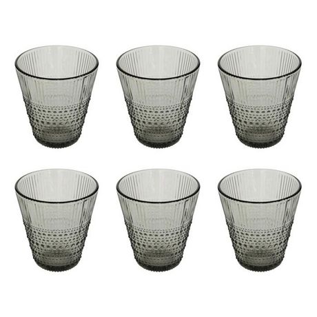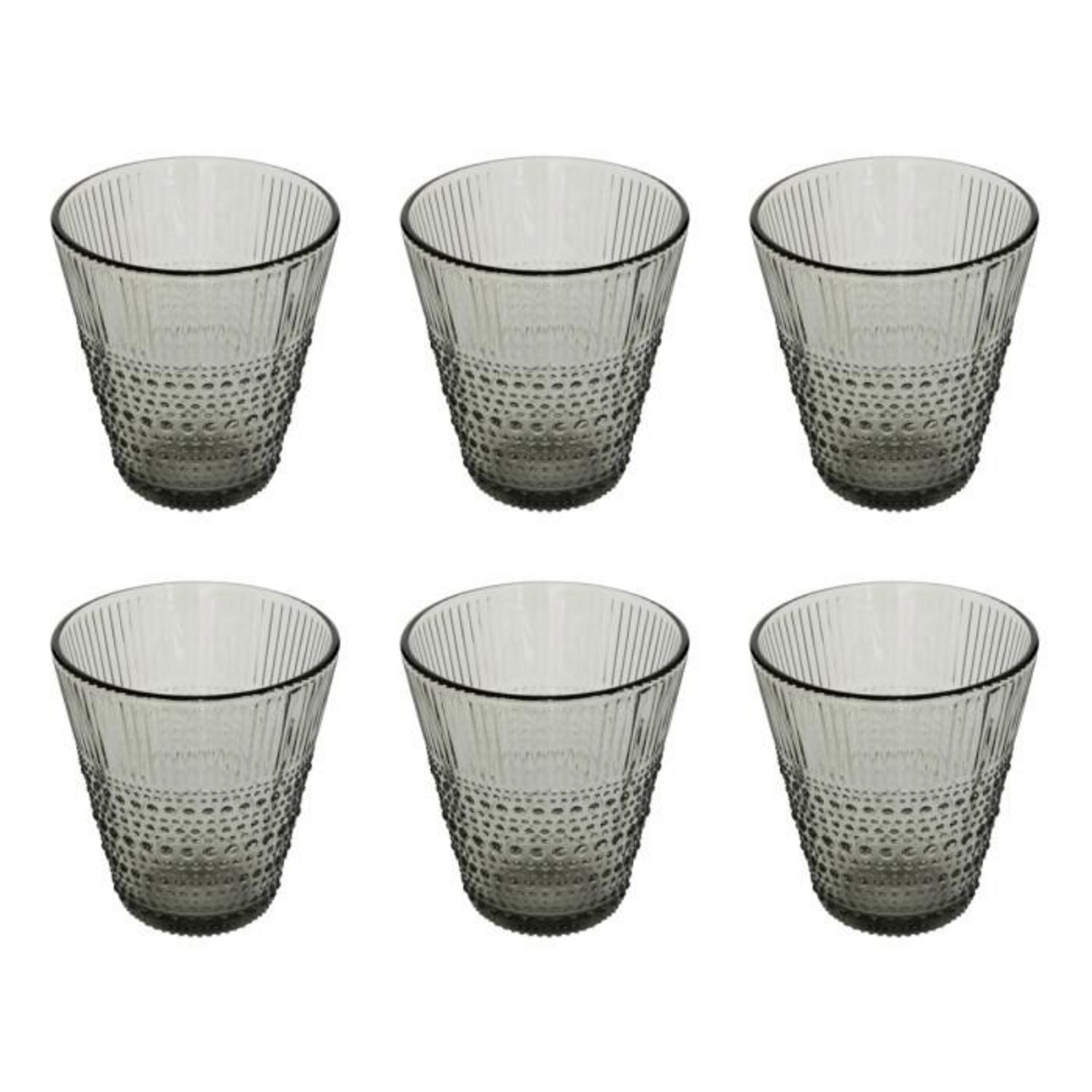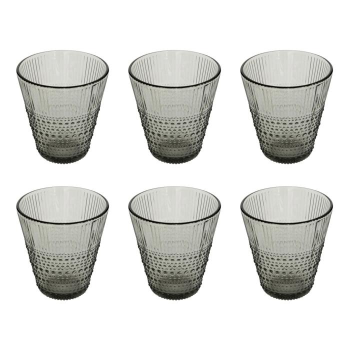 Informations Techniques : Dimensions : D. 9 x H. 9,6 cm Matière : Verre Spécificités : Élégant & Utile Lot de 6 verres à eau Motifs en relief Capacité : 27 cl Poids : 0,21 kg (à l'unité) Couleur : Gris
