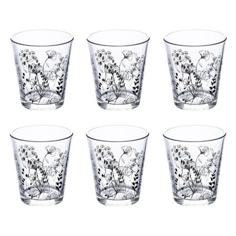 Informations Techniques : Dimensions : L. 8,8 x l. 8,8 x H. 10 cm Matière : Verre Spécificités : Pratique & Utile Lot de 6 verres Imprimé floral Compatible lave-vaisselle Capacité : 33 cl Poids : 0,26 kg (à l'unité) Couleur : Transparent