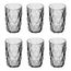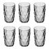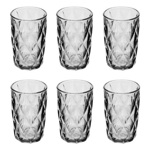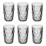 Informations Techniques : Dimensions : D. 8 x H. 12,7 cm Matière : Verre Spécificités : Élégant & Utile Lot de 6 gobelets hauts Motifs losanges en relief Capacité : 40 cl Poids : 0,33 kg (à l'unité) Couleur : Gris