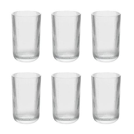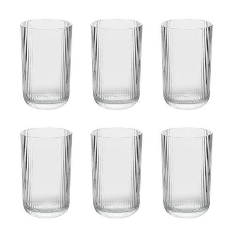 Informations Techniques : Dimensions : D. 7,9 x H. 12,8 cm Matière : Verre Spécificités : Élégant & Utile Lot de 6 verres hauts Design strié Capacité : 43 cl Poids : 0,35 kg (à l'unité) Couleur : Transparent