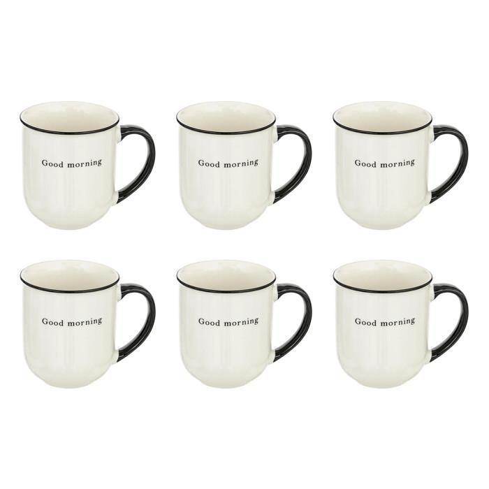 Informations Techniques : Dimensions : L. 12,5 x l. 8,7 x H. 10,3 cm Matière : New Bone Spécificités : Épuré & Utile Lot de 6 mugs Inscription Good morning Imitation porcelaine Capacité : 38 cl Poids : 0,3 kg (à l'unité) Couleur : Blanc & Noir