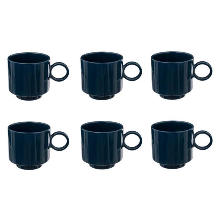 Informations Techniques : Dimensions : L. 13,9 x l. 9,2 x H. 9,5 cm Matière : Grès Spécificités : Rétro & Pratique Lot de 6 mugs Forme ronde Contenance : 38 cl Poids : 0,34 kg Couleur : Bleu Encre