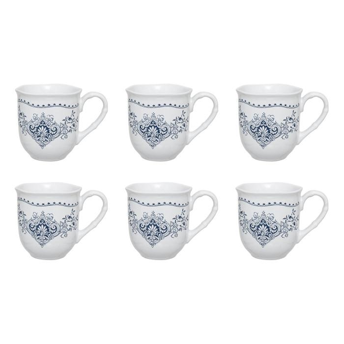 Informations Techniques : Dimensions : L. 10,6 x l. 8,6 x H. 9,1 cm Matière : Grès Spécificités : Pratique & Utile Lot de 6 mugs Motif imprimé Capacité : 32 cl Poids : 0,21 kg (à l'unité) Couleur : Blanc