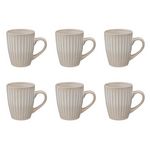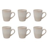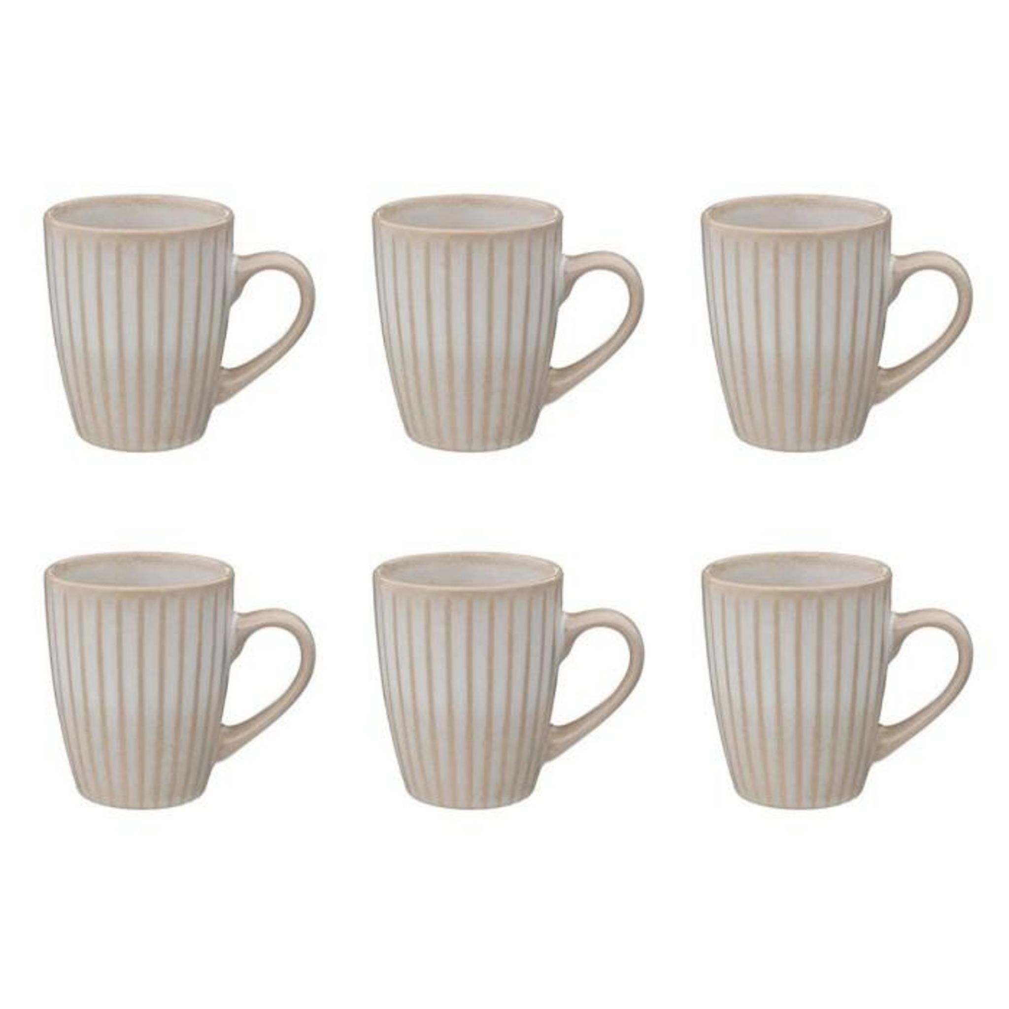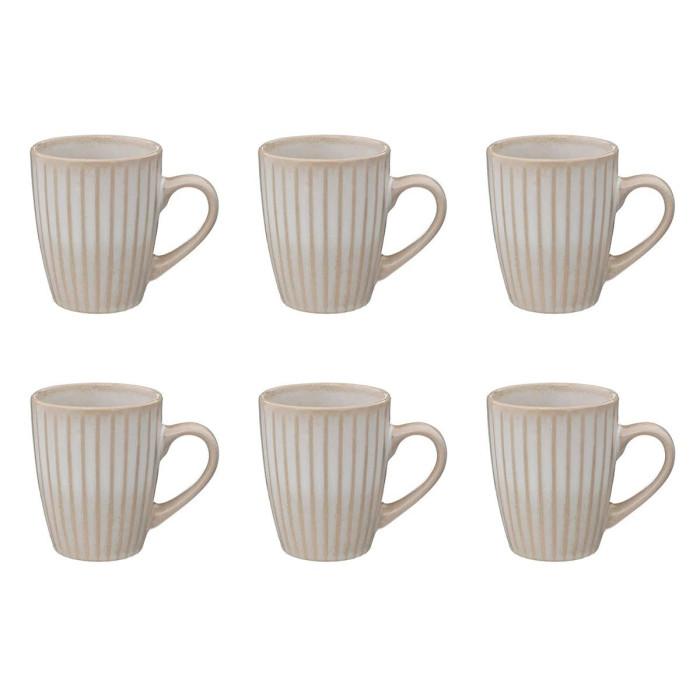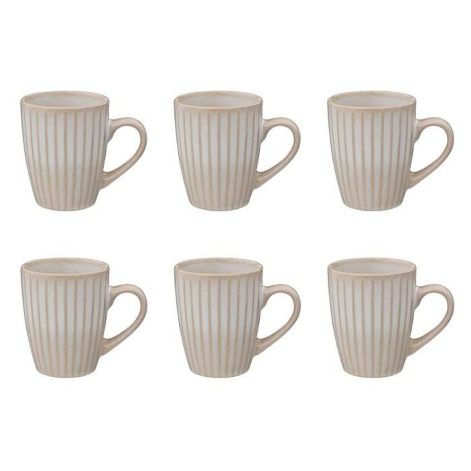 Informations Techniques : Dimensions : L. 12 x l. 8,8 x H. 11 cm Matière : Grès Spécificités : Pratique & Utile Lot de 6 mugs Avec rayures Passage au lave-vaisselle & micro-ondes Contenance : 38 cl Poids : 0,33 kg Couleur : Crème