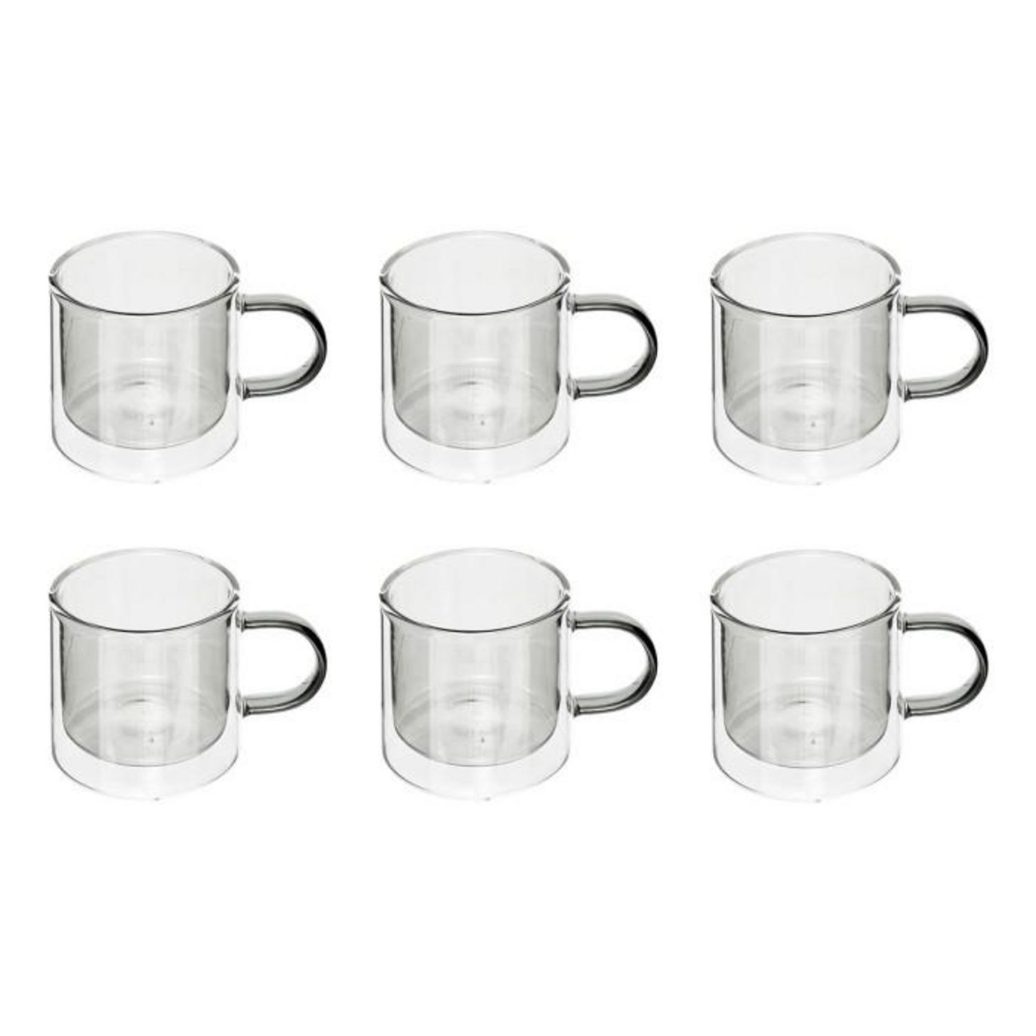 Informations Techniques : Dimensions : L. 12 x l. 8 x H. 8,5 cm Matière : Verre Spécificités : Pratique & Utile Lot de 6 mugs Double paroi Capacité : 25 cl Poids : 0,18 kg (à l'unité) Couleur : Gris