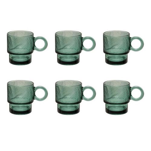 Informations Techniques : Dimensions : L. 12,5 x l. 8,3 x H. 9,2 cm Matière : Verre Spécificités : Pratique & Utile Lot de 6 mugs Design unicolore Compatible lave-vaisselle Capacité : 30 cl Poids : 0,31 kg (à l'unité) Couleur : Émeraude