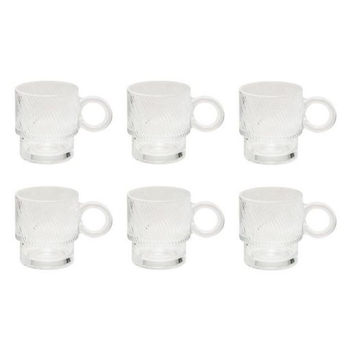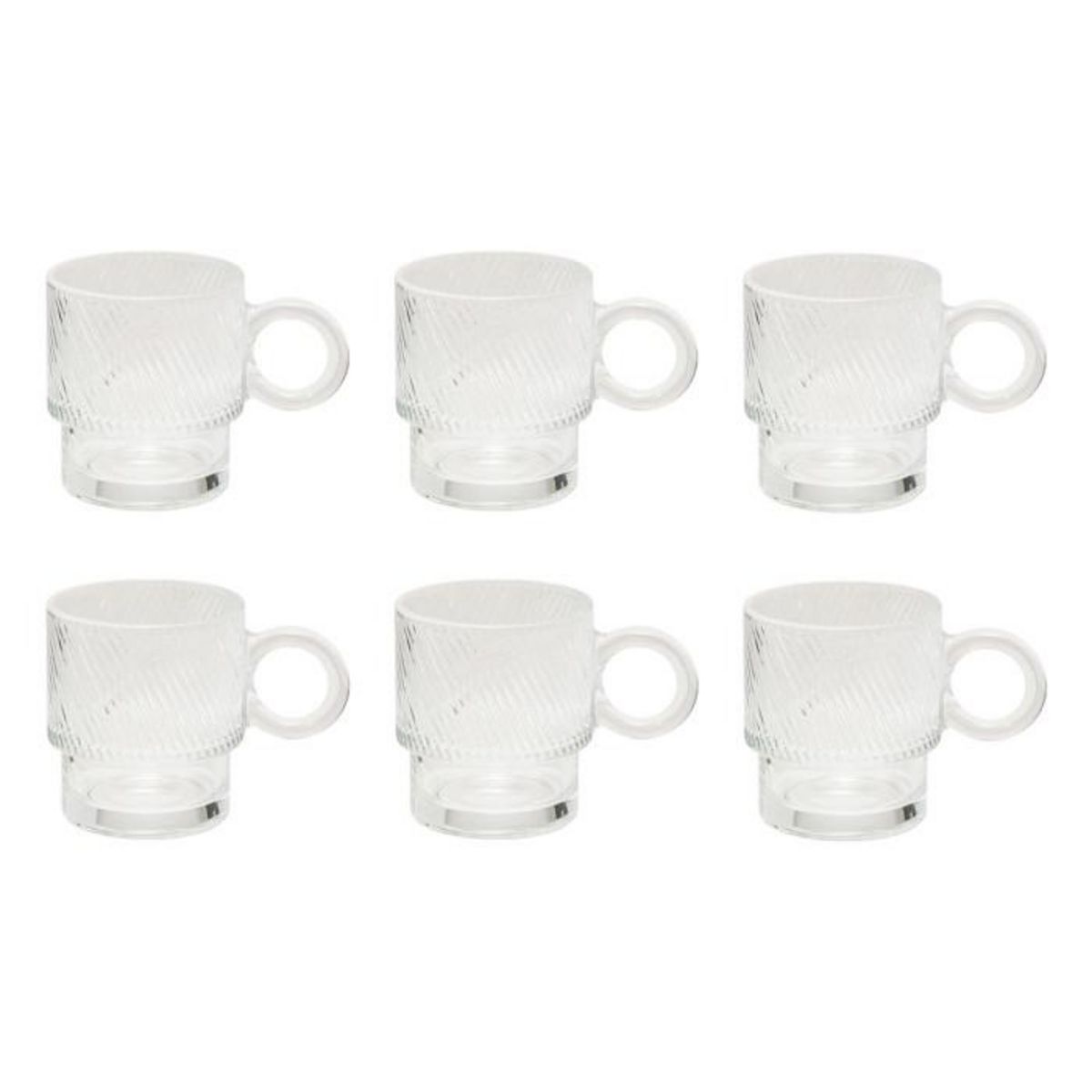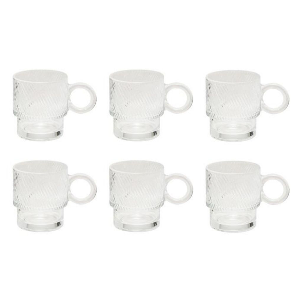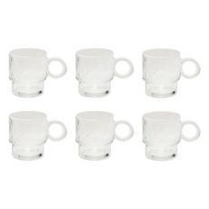 Informations Techniques : Dimensions : L. 12,5 x l. 8,3 x H. 9,2 cm Matière : Verre Spécificités : Pratique & Utile Lot de 6 mugs Compatible lave-vaisselle Capacité : 30 cl Poids : 0,31 kg (à l'unité) Couleur : Transparent