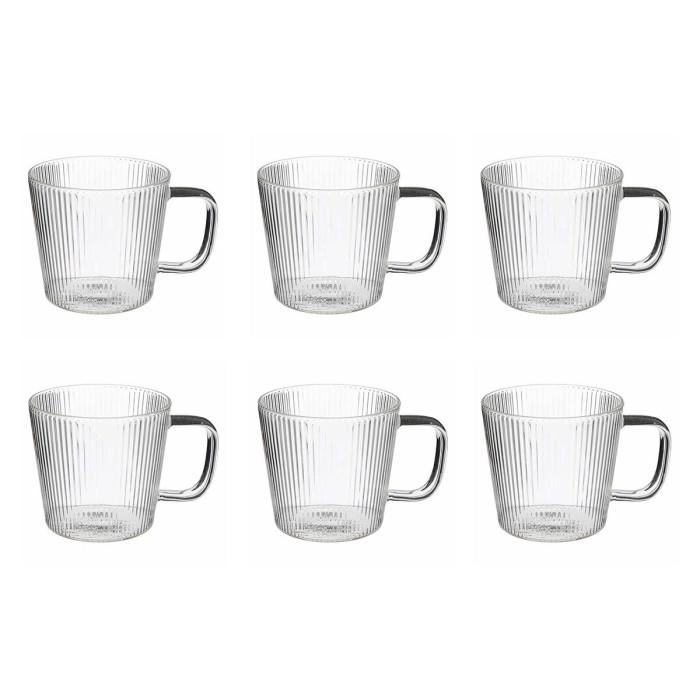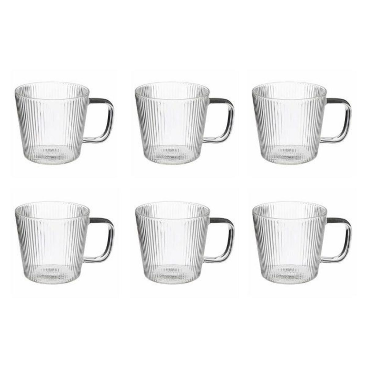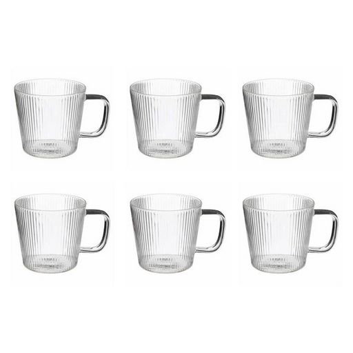 Informations Techniques : Dimensions : L. 11,3 x l. 8 x H. 8,5 cm Matière : Verre Spécificités : Chic & Pratique Lot de 6 mugs Design strié Forme ronde Contenance : 30 cl Poids : 0,1 kg Couleur : Transparent