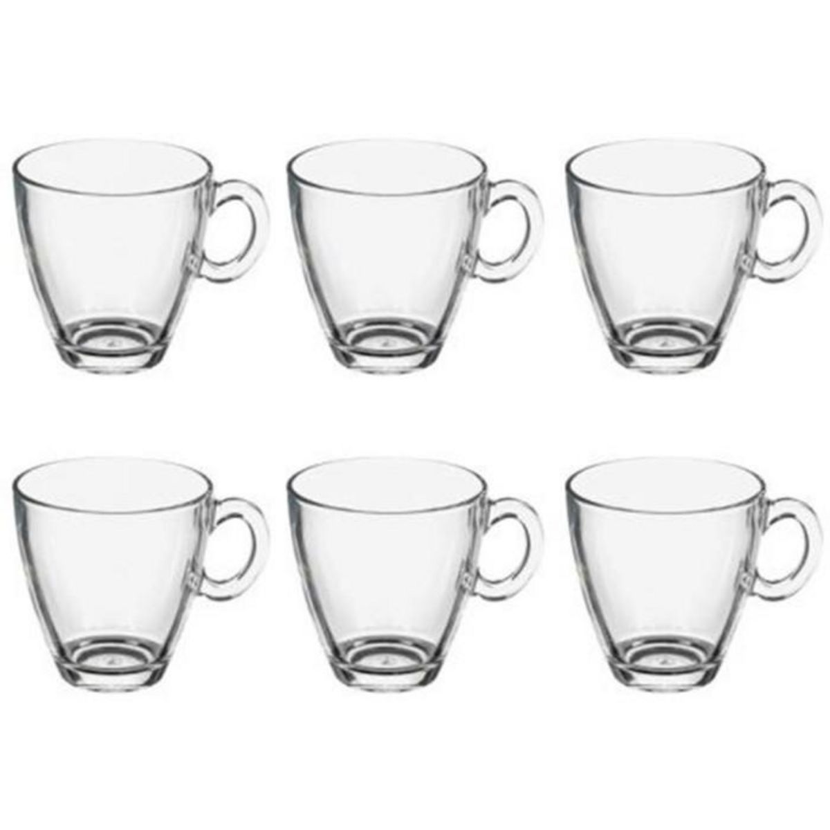 Informations Techniques : Dimensions : D. 8 x H. 8,5 cm Matière : Verre Spécificités : Contenance : 21 cl 6 Mugs avec Poignées Vendu en lot de 6 Poids : 220 g Couleur : Transparent
