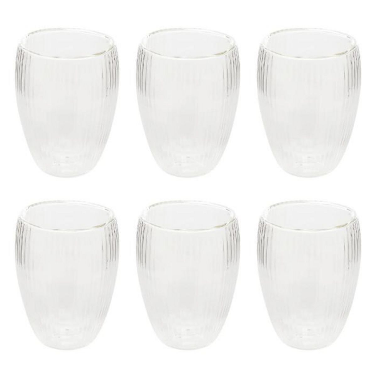 Informations Techniques : Dimensions : D. 8,5 x H. 11 cm Matière : Verre Spécificités : Élégant & Utile Lot de 6 mugs Design strié Compatible lave-vaisselle Capacité : 28 cl Poids : 0,15 kg (à l'unité) Couleur : Transparent
