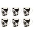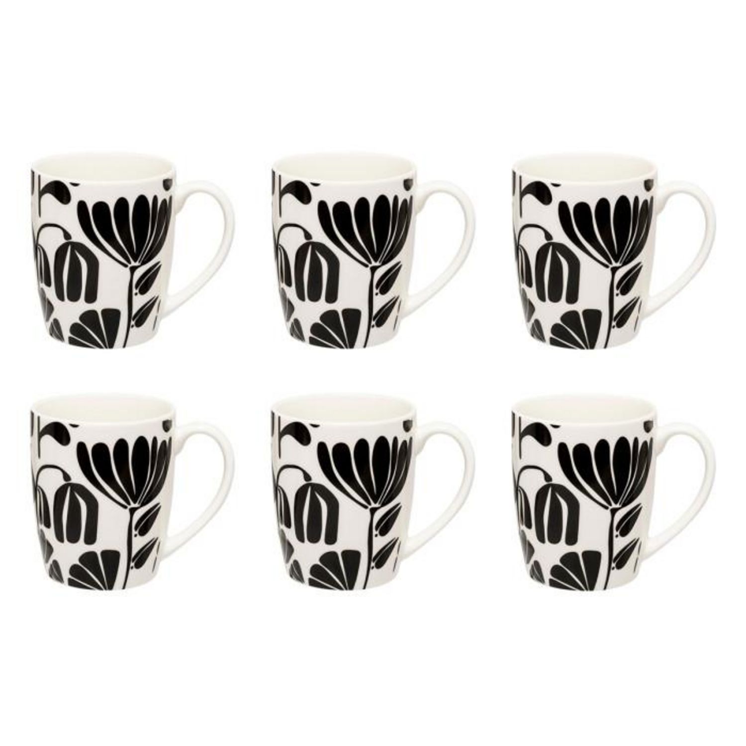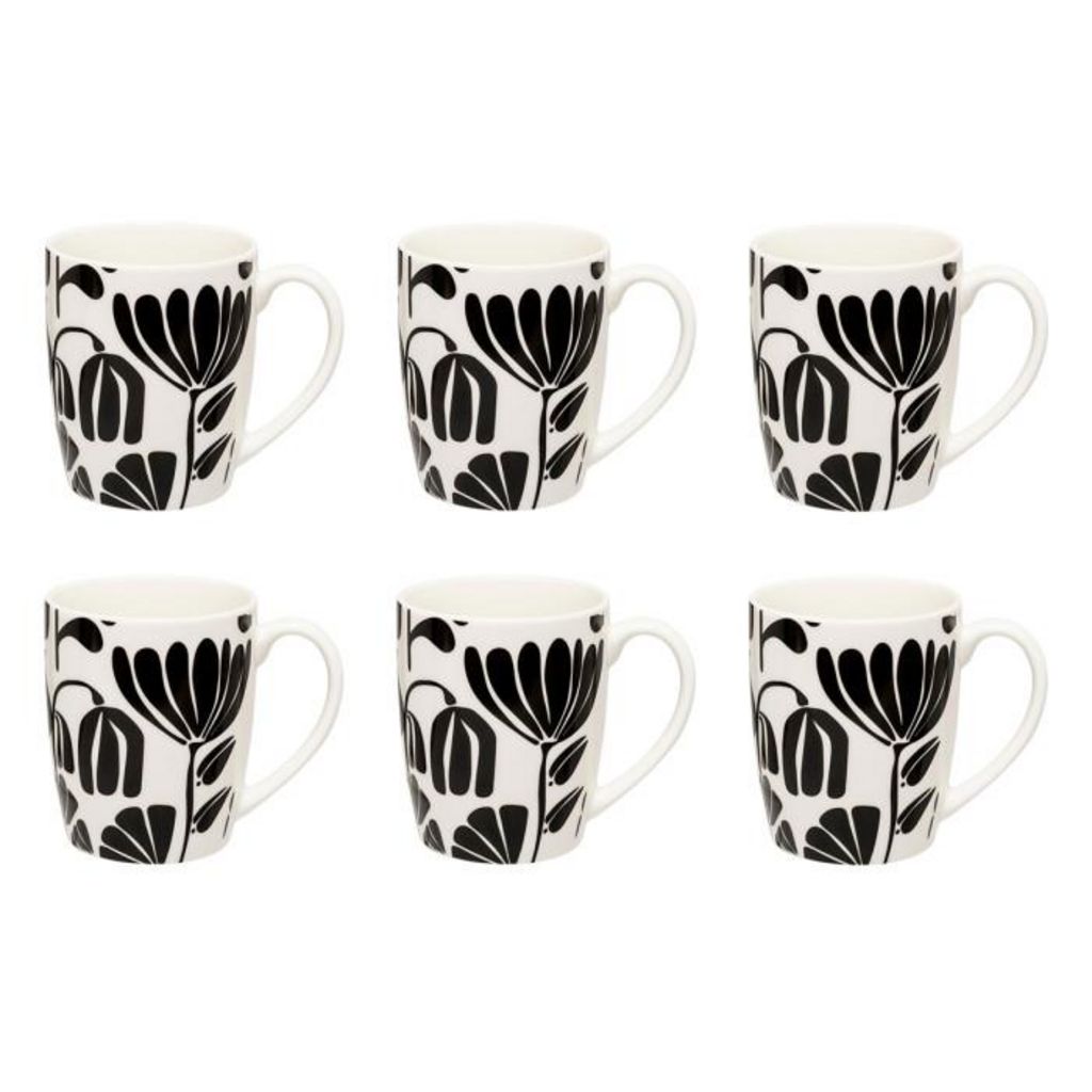 Informations Techniques : Dimensions : L. 12 x l. 8,3 x H. 10,3 cm Matière : Porcelaine Spécificités : Original & Utile Lot de 6 mugs Imprimé floral Design bicolore Capacité : 37 cl Poids : 0,29 kg (à l'unité) Couleur : Noir & Blanc