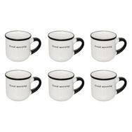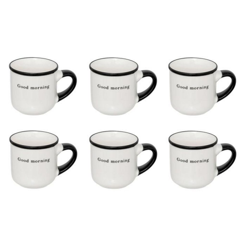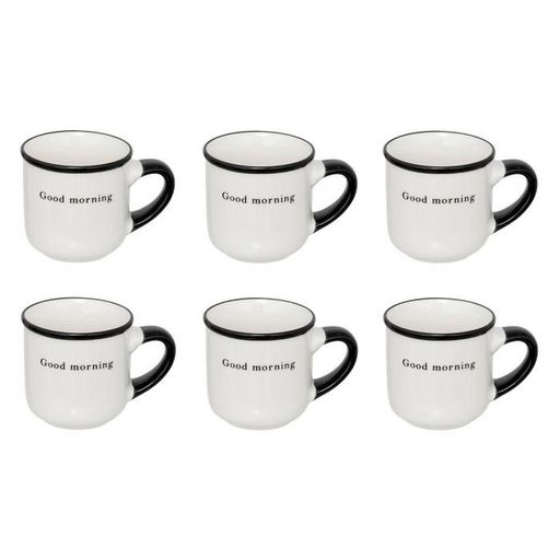 Informations Techniques : Dimensions : L. 6,3 x l. 6 x H. 8,5 cm Matière : New Bone Spécificités : Épuré & Utile Lot de 6 tasses à café Inscription Good morning Imitation porcelaine Capacité : 10 cl Poids : 0,12 kg (à l'unité) Couleur : Blanc & Noir