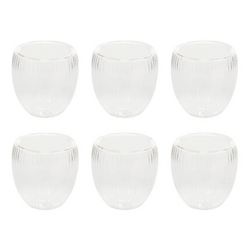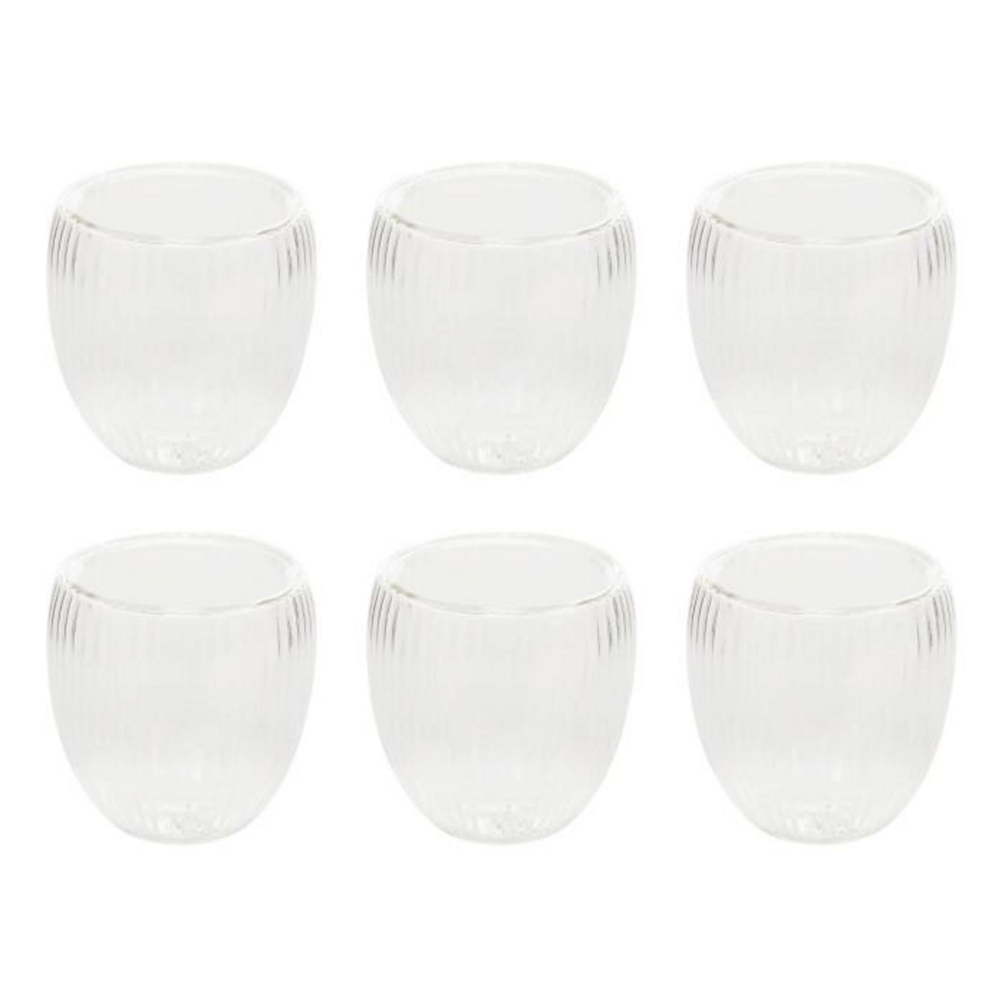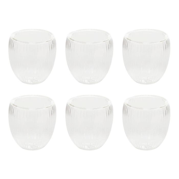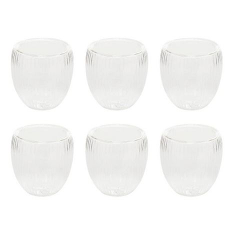 Informations Techniques : Dimensions : D. 7,7 x H. 7,8 cm Matière : Verre Spécificités : Élégant & Utile Lot de 6 tasses à café Design strié Compatible lave-vaisselle Capacité : 12 cl Poids : 0,09 kg (à l'unité) Couleur : Transparent