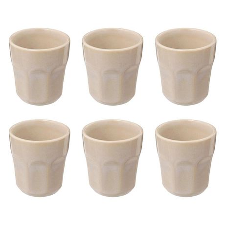 Informations Techniques : Dimensions : D. 5,7 x H. 6,3 cm Matière : Grès Spécificités : Élégant & Utile Lot de 6 tasses à café Forme ronde Chaque produit est unique, des variations de couleurs peuvent survenir d'un produit à l'autre Contenance : 8 cl Poids : 0,1 kg (à l'unité) Couleur : Be