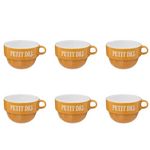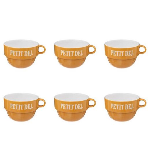 Informations Techniques : Dimensions : D. 12,7 x H. 8,6 cm Matière : Faïence Spécificités : Tendance & Pratique Lot de 6 Tasses design Forme Ronde Passage au Lave-Vaisselle & au Micro-Ondes Contact Alimentaire Contenance : 62 cl Poids : 0,492 kg Couleur : Jaune
