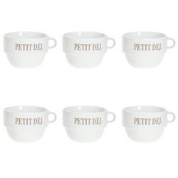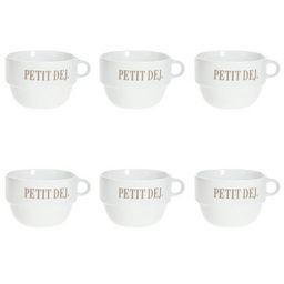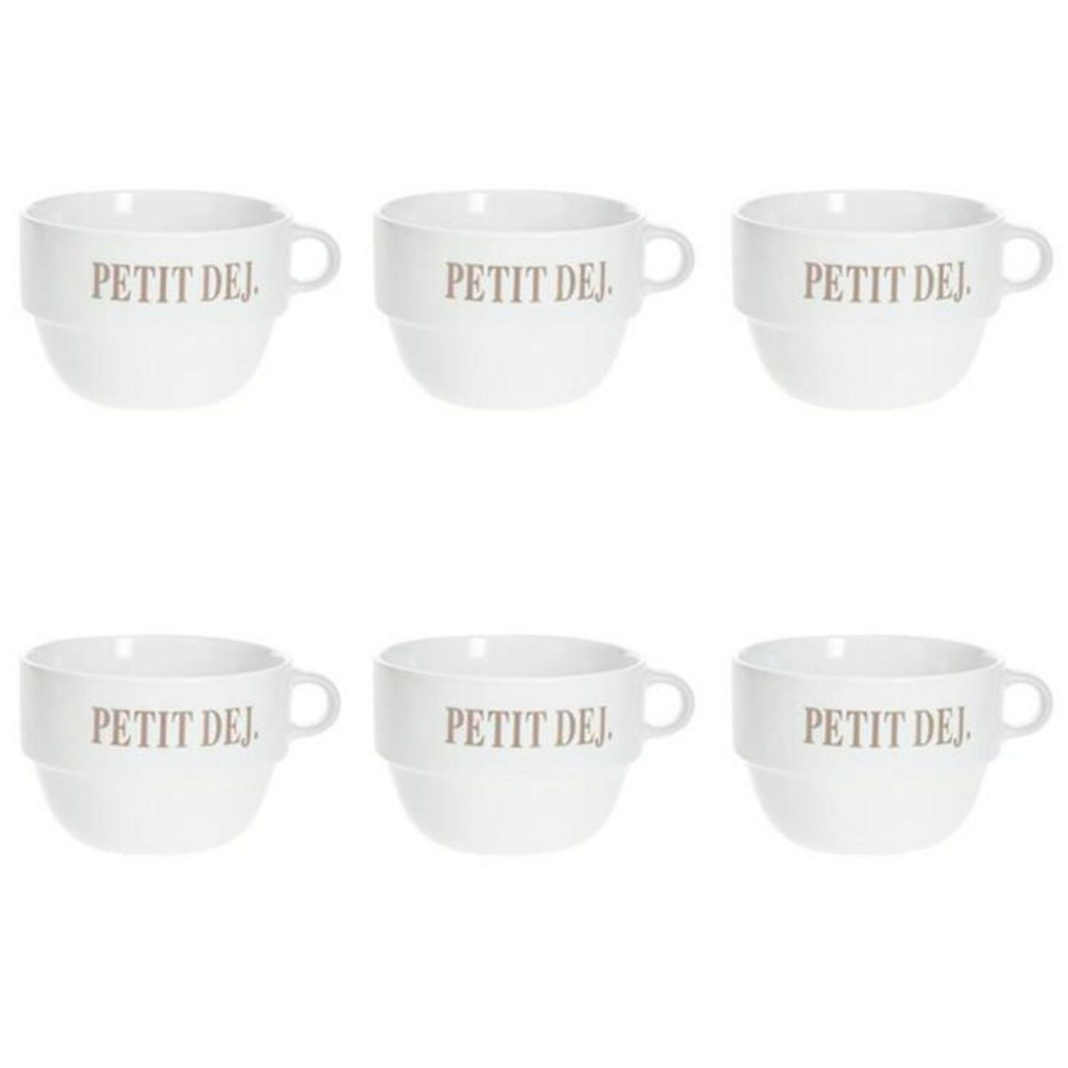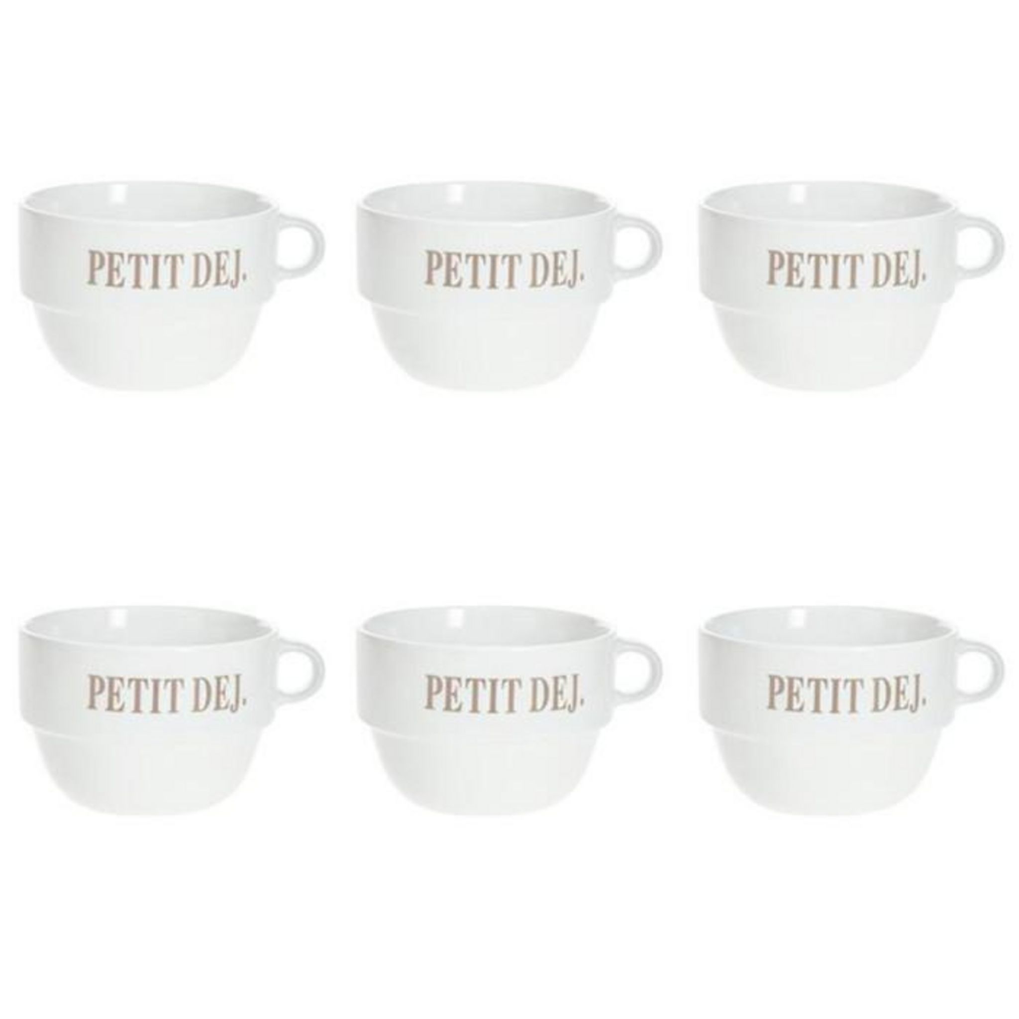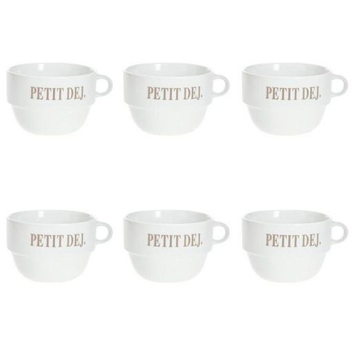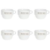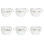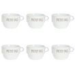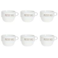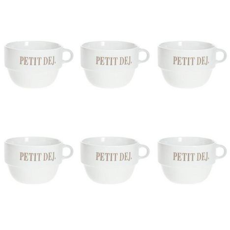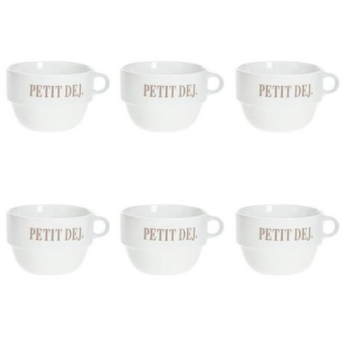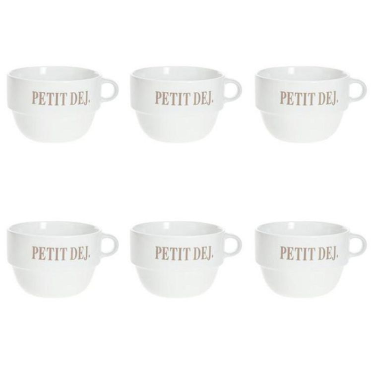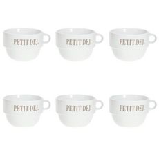 Informations Techniques : Dimensions : D. 12,7 x H. 8,6 cm Matière : Faïence Spécificités : Tendance & Pratique Lot de 6 Tasses design Forme Ronde Passage au Lave-Vaisselle & au Micro-Ondes Contact Alimentaire Contenance : 62 cl Poids : 0,492 kg Couleur : Blanc