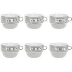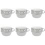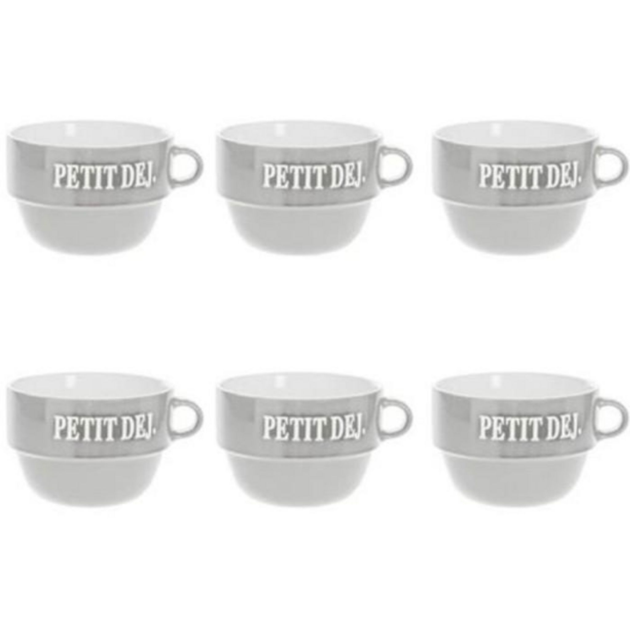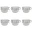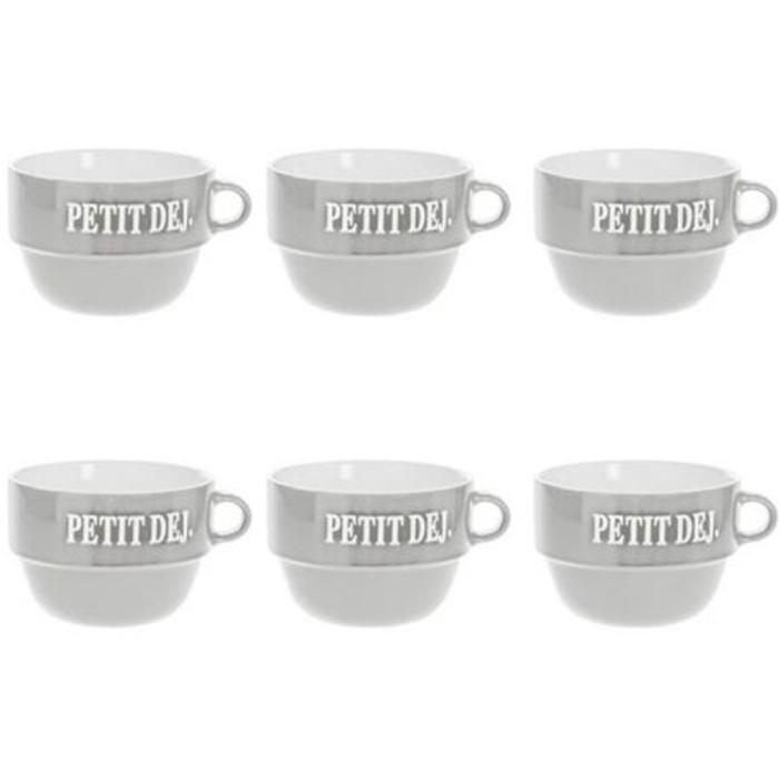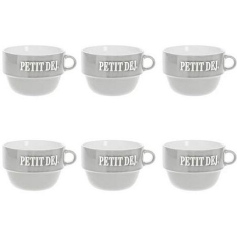 Informations Techniques : Dimensions : D. 12,7 x H. 8,6 cm Matière : Faïence Spécificités : Tendance & Pratique Lot de 6 Tasses design Forme Ronde Passage au Lave-Vaisselle & au Micro-Ondes Contact Alimentaire Contenance : 62 cl Poids : 0,492 kg Couleur : Gris