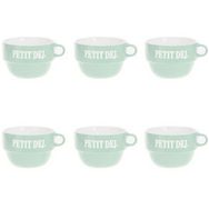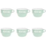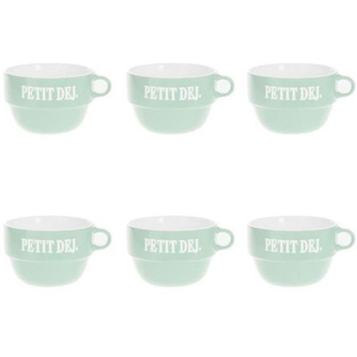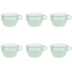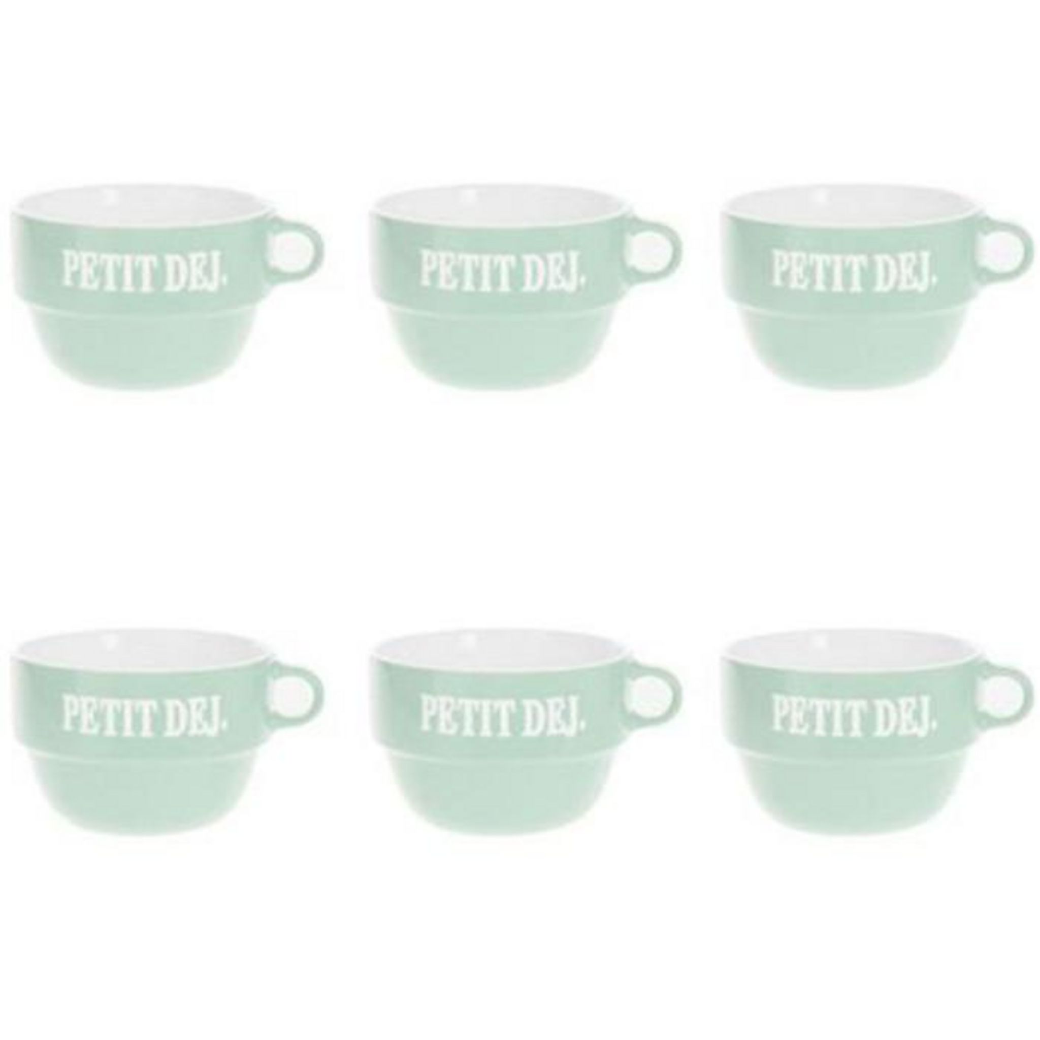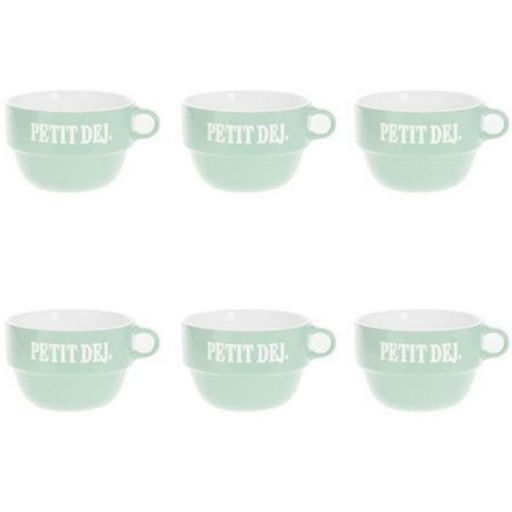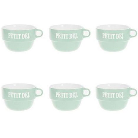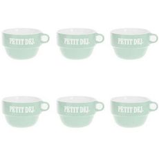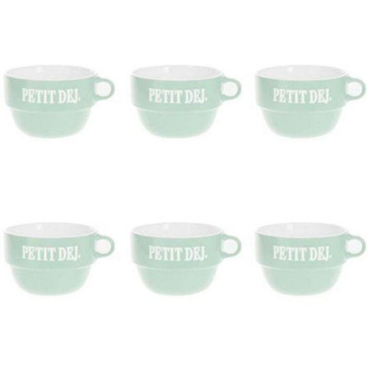 Informations Techniques : Dimensions : D. 12,7 x H. 8,6 cm Matière : Faïence Spécificités : Tendance & Pratique Lot de 6 Tasses design Forme Ronde Passage au Lave-Vaisselle & au Micro-Ondes Contact Alimentaire Contenance : 62 cl Poids : 0,492 kg Couleur : Menthe