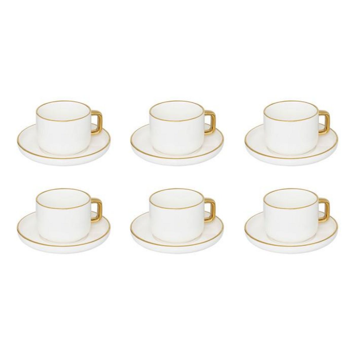 Informations Techniques : Dimensions : L. 15,4 x l. 15,4 x H. 7,4 cm Matière : Porcelaine Spécificités : Pratique & Épuré Lot de 6 tasses Avec sous-tasses Liserés dorés Capacité : 25 cl Poids : 0,52 kg (à l'unité) Couleur : Blanc