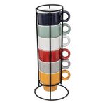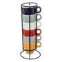 Informations Techniques : Dimensions : L. 9,2 x l. 8,8 x H. 22 cm Tasse : D. 5,5 x H. 5,6 cm Matière : Faïence Spécificités : Tendance & Pratique Lot de 6 Tasses à Café Sur Rack Forme Ronde 6 Couleur : Bleu, Menthe, Gris, Blanc, Jaune & Rouge Contenance : 5 cl Poids : 0,67 kg Couleur : Multicolore