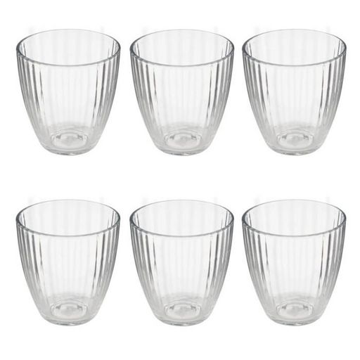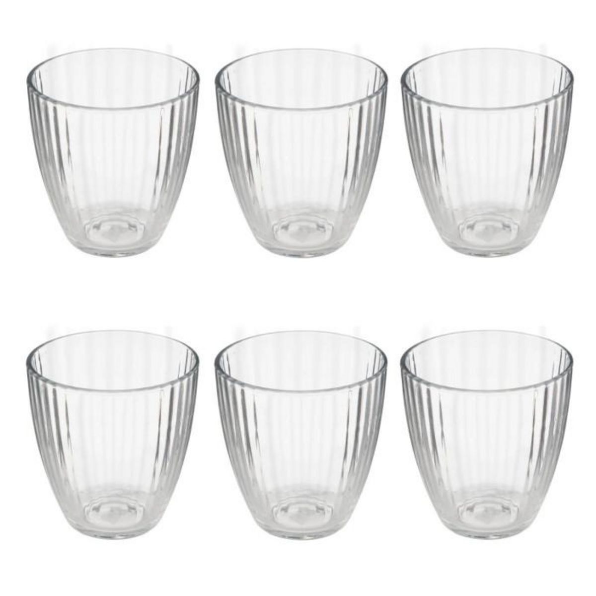 Informations Techniques : Dimensions : L. 8,3 x l. 8,3 x H. 9 cm Matière : Verre Spécificités : Pratique & Tendance Lot de 6 verres à eau Design strié Forme ronde Capacité : 28 cl Poids : 0,21 kg (à l'unité) Couleur : Transparent