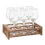 Informations Techniques : Dimensions : L. 28 x l. 18 x H. 21,8 cm Matière : Verre & Bois (Manguier) Spécificités : Pratique & Utile Lot de 4 verres à vin Avec support Contenance : 30 cl Poids : 1,77 kg Couleur : Transparent