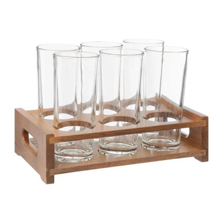 Informations Techniques : Dimensions : L. 25,2 x l. 15,8 x H. 17 cm Matière : Verre & Bois (Manguier) Spécificités : Pratique & Convivial Lot de 6 verres avec support Forme ronde Contenance : 30 cl Poids : 2,52 kg Couleur : Transparent