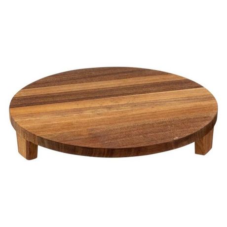 Informations Techniques : Dimensions : D. 30 x H. 4,5 cm Matière : Bois (Acacia) Spécificités : Pratique & Utile Plat de présentation sur pied Forme ronde Poids : 0,61 kg Couleur : Marron